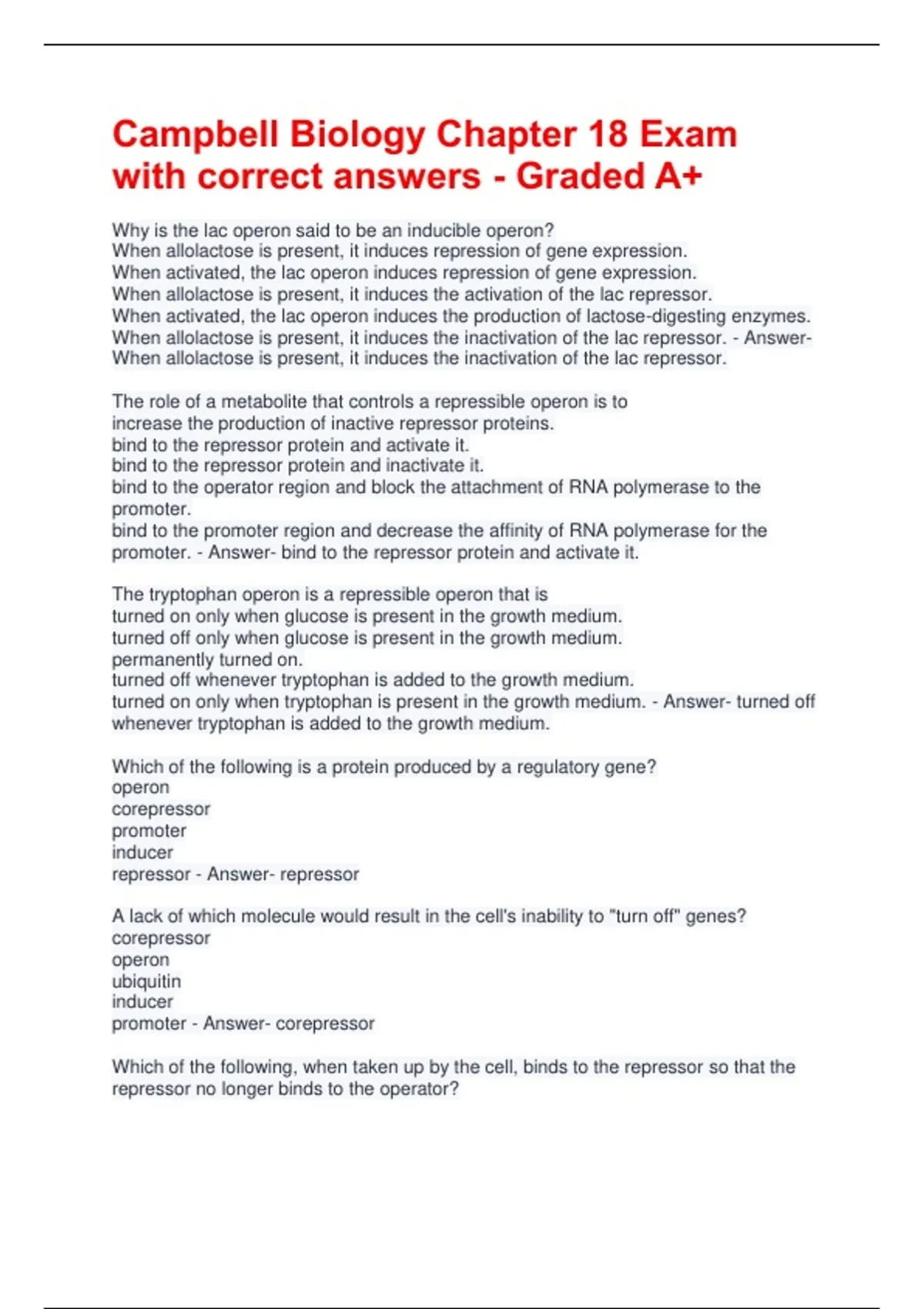Campbell Biology Chapter 18 Exam with correct answers - Graded A+ Why is the lac operon said to be an inducible operon? When allolactose is present, it induces repression of gene expression. When activated, the lac operon induces repression of gene expression. When allolactose is present, it induces the activation of the lac repressor. When activated, the lac operon induces the production of lactose-digesting enzymes. When allolactose is present, it induces the inactivation of the lac repressor. - Answer- When allolactose is present, it induces the inactivation of the lac repressor. The role of a metabolite that controls a repressible operon is to increase the production of inactive repressor proteins. bind to the repressor protein and activate it. bind to the repressor protein and inactivate it. bind to the operator region and block the attachment of RNA polymerase to the promoter. bind to the promoter region and decrease the affinity of RNA polymerase for the promoter. - Answer- bind to the repressor protein and activate it. The tryptophan operon is a repressible operon that is turned on only when glucose is present in the growth medium. turned off only when glucose is present in the growth medium. permanently turned on. turned off whenever tryptophan is added to the growth medium. turned on only when tryptophan is present in the growth medium. - Answer- turned off whenever tryptophan is added to the growth medium. Which of the following is a protein produced by a regulatory gene? operon corepressor promoter inducer repressor - Answer- repressor A lack of which molecule would result in the cell's inability to "turn off" genes? corepressor operon ubiquitin inducer promoter - Answer- corepressor Which of the following, when taken up by the cell, binds to the repressor so that the repressor no longer binds to the operator? ubiquitin promoter corepressor repressor inducer - Answer- inducer Most repressor proteins are allosteric. Which of the following binds with the repressor to alter its conformation? transcription factor cAMP RNA polymerase promoter inducer - Answer- inducer A mutation that inactivates the regulatory gene of a repressible operon in an E. coli cell would result in continuous transcription of the structural gene controlled by that regulator. inactivation of RNA polymerase by alteration of its active site. complete inhibition of transcription of the structural gene controlled by that regulator. irreversible binding of the repressor to the operator. continuous translation of the mRNA because of alteration of its structure. - Answer- continuous transcription of the structural gene controlled by that regulator The lactose operon is likely to be transcribed when the cyclic AMP levels are low. the cyclic AMP and lactose levels are both high within the cell. there is glucose but no lactose in the cell. there is more glucose in the cell than lactose. the cAMP level is high and the lactose level is low. - Answer- the cyclic AMP and lactose levels are both high within the cell Transcription of the structural genes in an inducible operon occurs continuously in the cell. stops when the pathway's product is present. starts when the pathway's product is present. starts when the pathway's substrate is present. does not result in the production of enzymes. - Answer- starts when the pathway's substrate is present For a repressible operon to be transcribed, which of the following must occur? RNA polymerase must bind to the promoter, and the repressor must be inactive. RNA polymerase and the active repressor must be present. RNA polymerase cannot be present, and the repressor must be inactive. A corepressor must be present. RNA polymerase must not occupy the promoter, and the repressor must be inactive. - Answer- RNA polymerase must bind to the promoter, and the repressor must be inactive Allolactose, an isomer of lactose, is formed in small amounts from lactose. An E. coli cell is presented for the first time with the sugar lactose (containing allolactose) as a potential food source. Which of the following occurs when the lactose enters the cell? RNA polymerase attaches to the regulator. The repressor protein attaches to the regulator. Allolactose binds to the repressor protein. Allolactose binds to the regulator gene. The repressor protein and allolactose bind to RNA polymerase. - Answer- Allolactose binds to the repressor protein Altering patterns of gene expression in prokaryotes would most likely serve the organism's survival in which of the following ways? allowing young organisms to respond differently from more mature organisms allowing the organism to adjust to changes in environmental conditions allowing environmental changes to alter the prokaryote's genome allowing each gene to be expressed an equal number of times organizing gene expression so that genes are expressed in a given order - Answer- allowing the organism to adjust to changes in environmental conditions