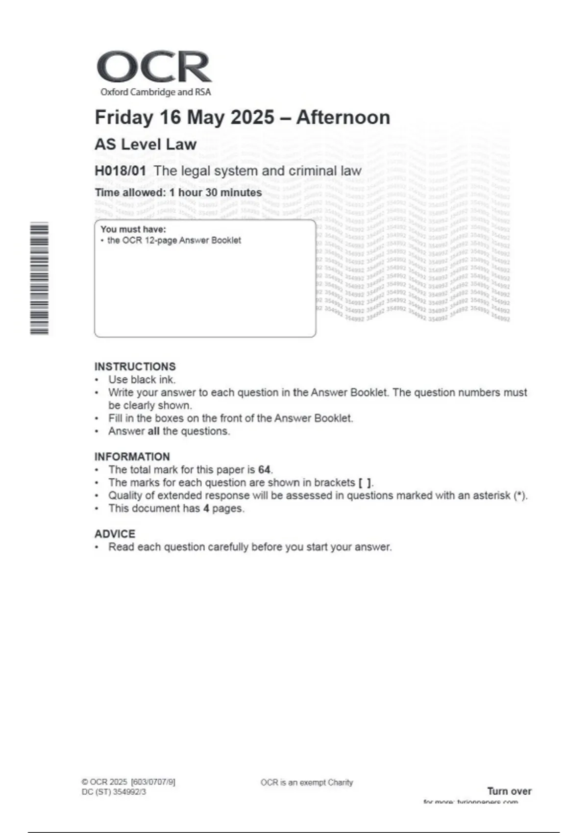 OCR AS Level Law H018/01 The legal system and criminal law June 2025