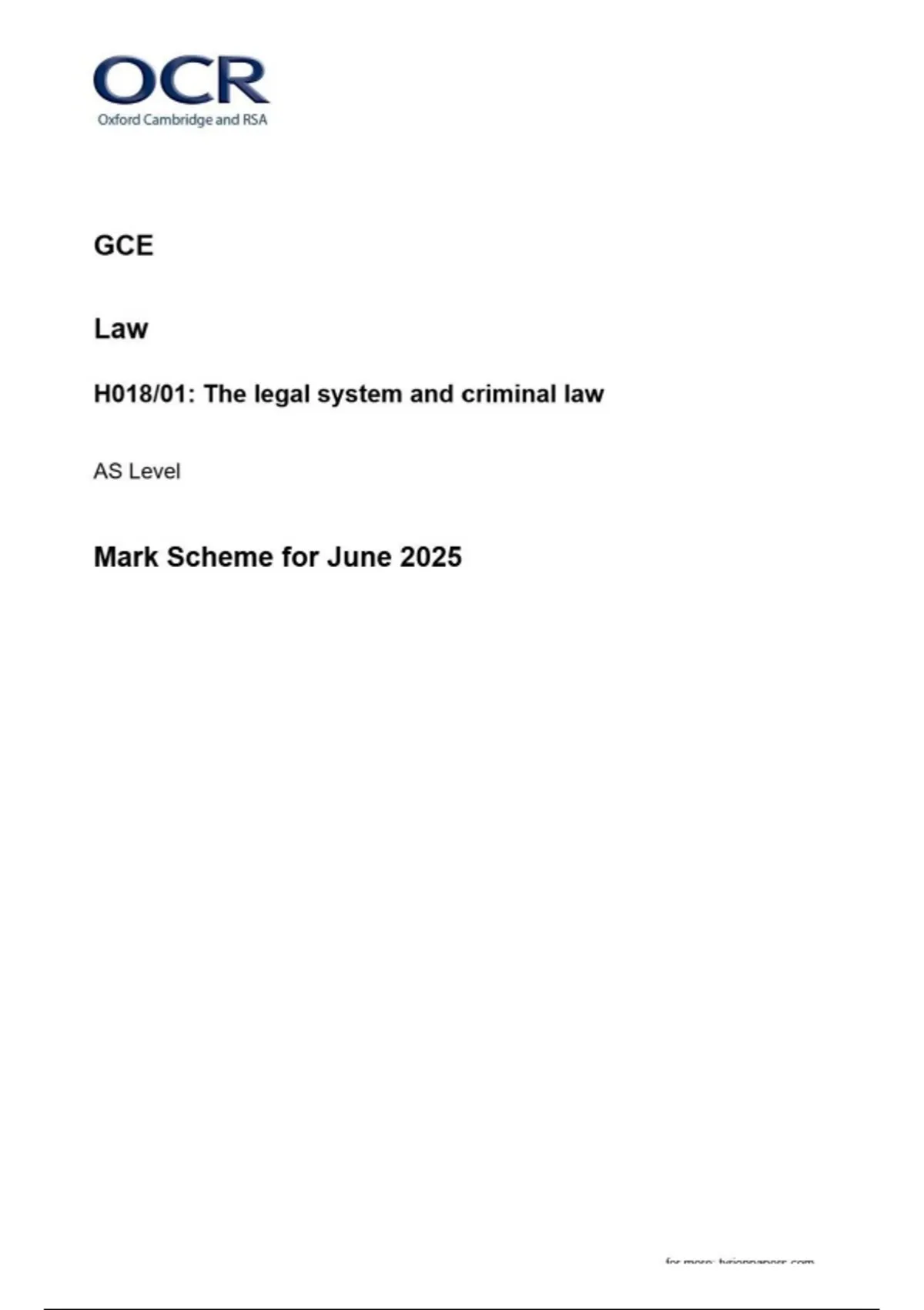 OCR GCE Law H018/01: The legal system and criminal law AS Level Mark Scheme for June 2025