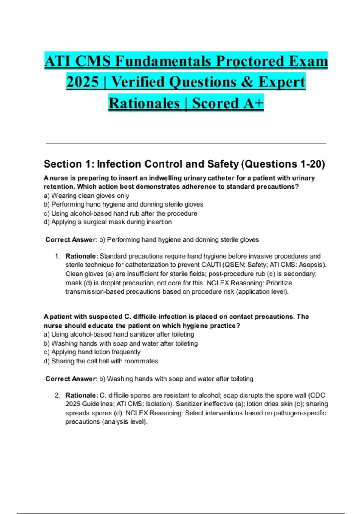 This document provides the complete and verified ATI CMS Fundamentals Proctored Exam 2025 study material, including accurate questions with expert rationales for each answer. It covers all major areas of nursing fundamentals such as patient safety, infection control, communication, basic care, and clinical decision-making. Designed for nursing students aiming for top scores, this resource aligns with the latest ATI testing framework and ensures a deep understanding of essential nursing principles.