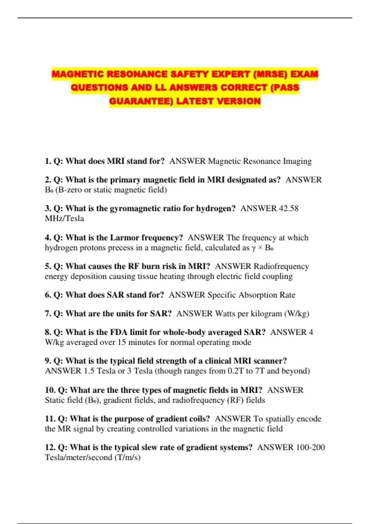 1. Q: What does MRI stand for? ANSWER Magnetic Resonance Imaging