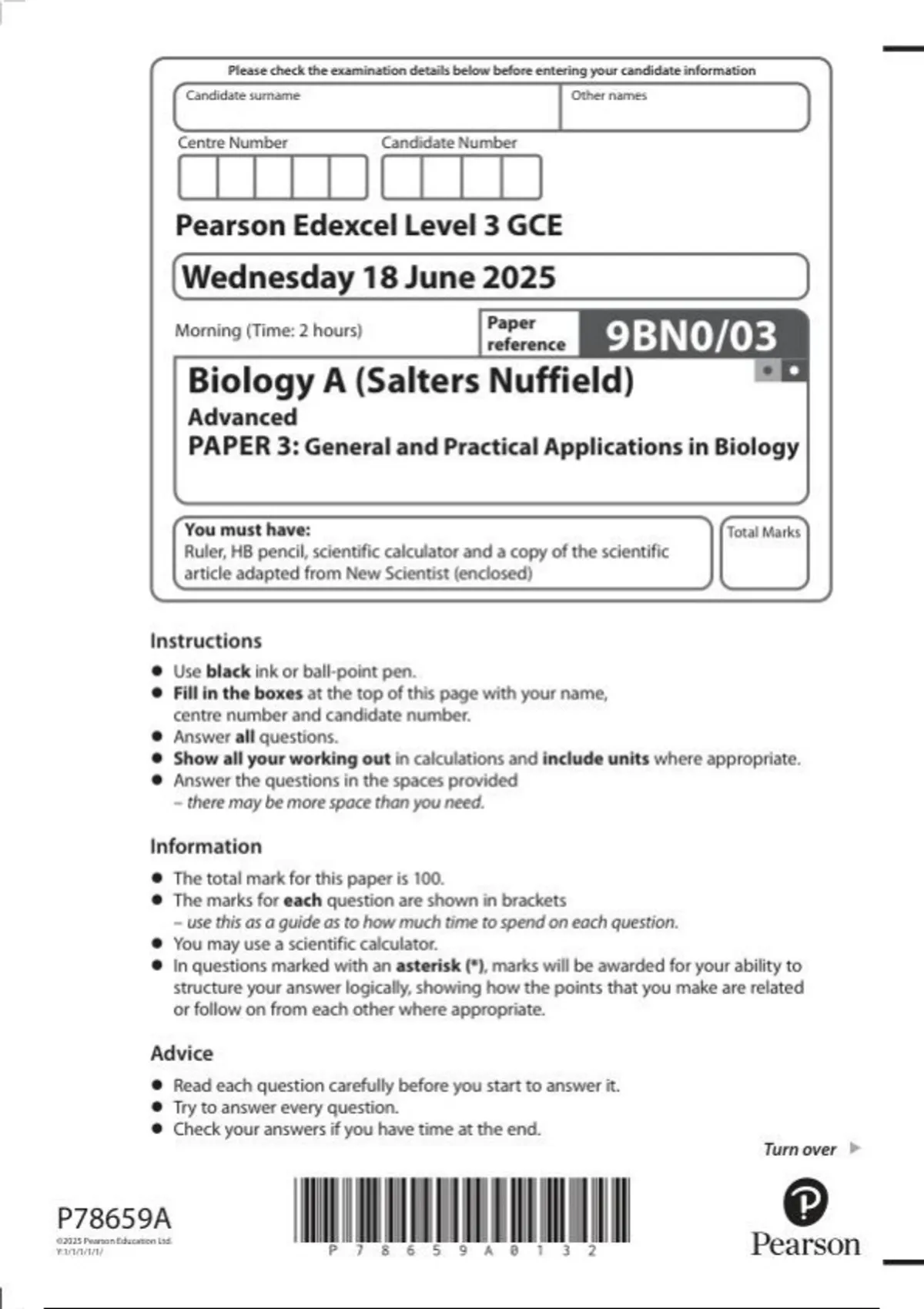 Pearson Edexcel a level Biology A |question paper | 2025| 9BN0/03