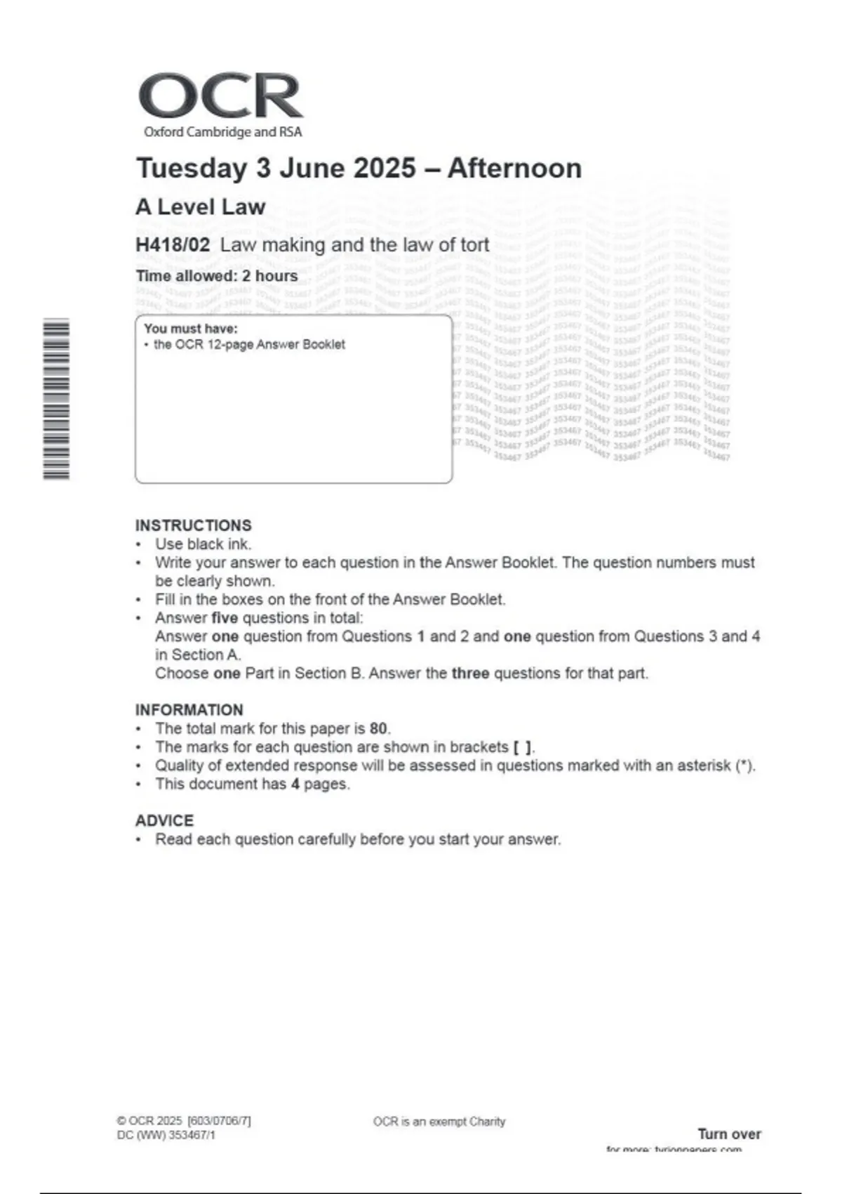 OCR A Level Law H418/02 Law making and the law of tort June 2025