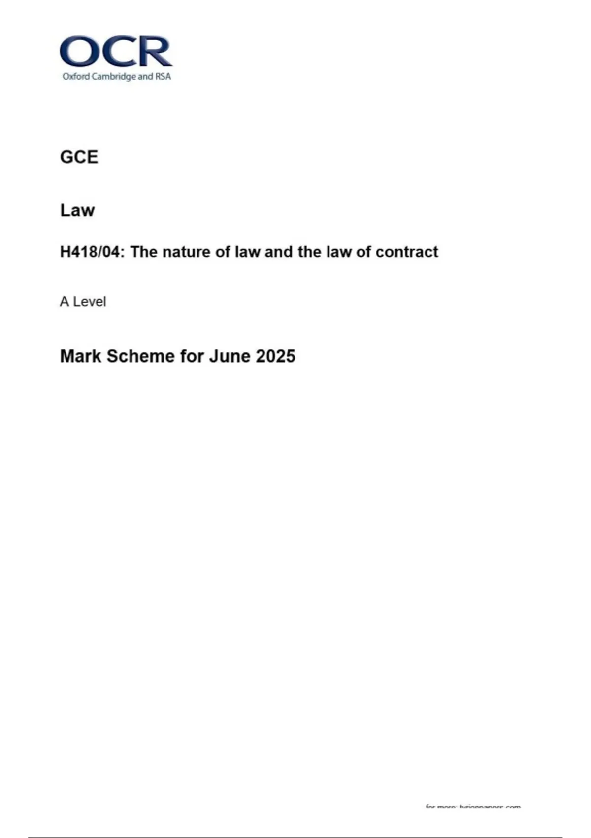 OCR GCE Law H418/04: The nature of law and the law of contract A Level Mark Scheme for June 2025