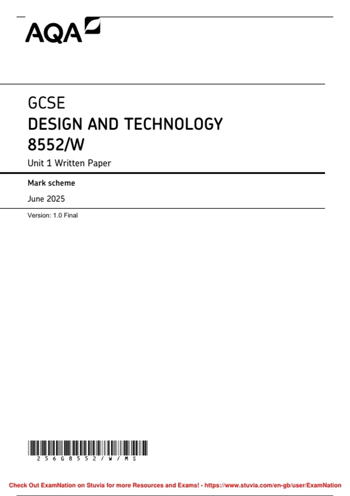 , MARK SCHEME – GCSE DESIGN AND TECHNOLOGY – 8552/W – JUNE 2025