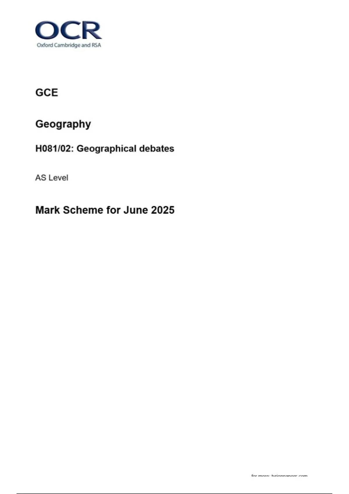 OCR GCE Geography H081/02: Geographical debates AS Level Mark Scheme for June 2025