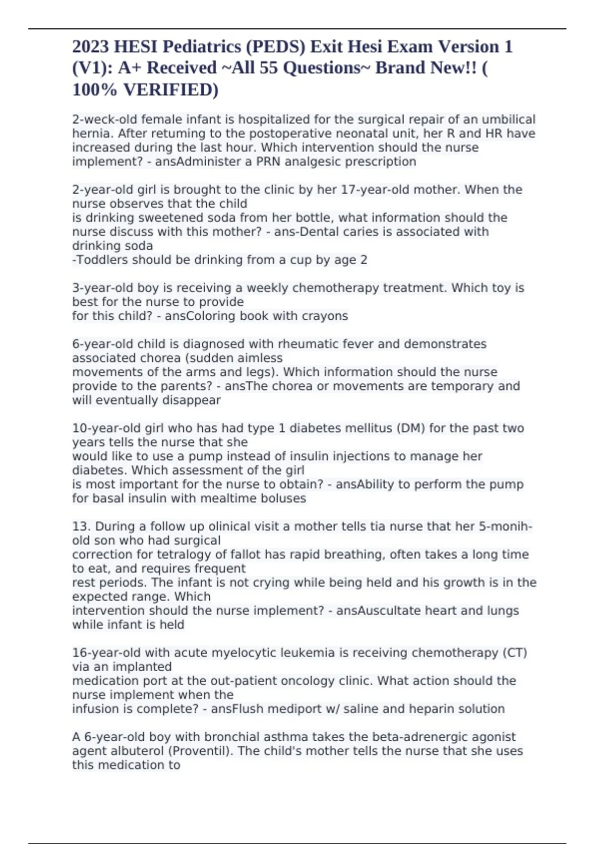 2023 HESI Pediatrics (PEDS) Exit Hesi Exam Version 1 (V1) A+ Received -All 55 Questions- Brand New!! (