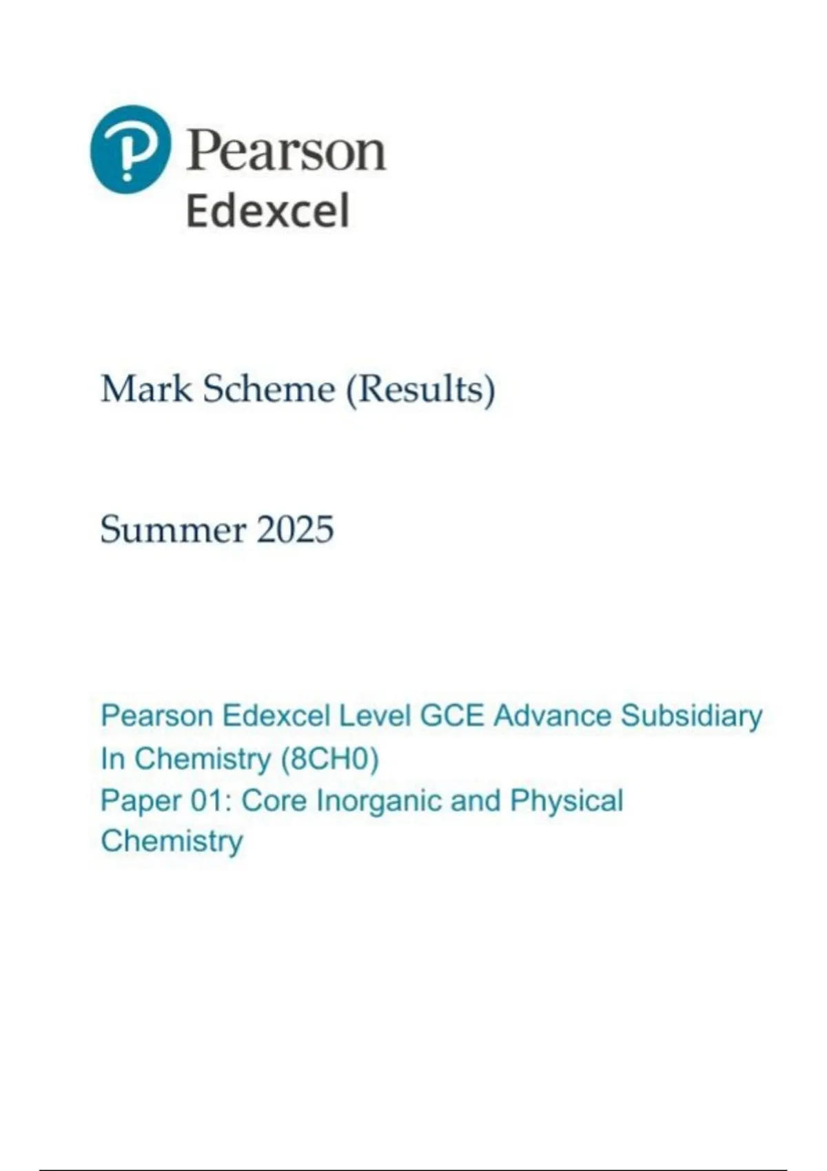 Pearson Edexcel Level GCE Advance Subsidiary In Chemistry (8CHO) Paper 01: Core Inorganic and Physical Chemistry marking scheme June 2025
