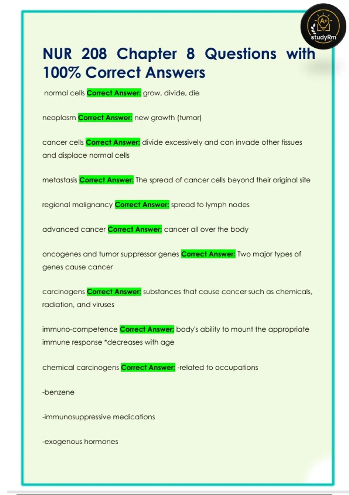 carcinogens Correct Answer: substances that cause cancer such as chemicals,