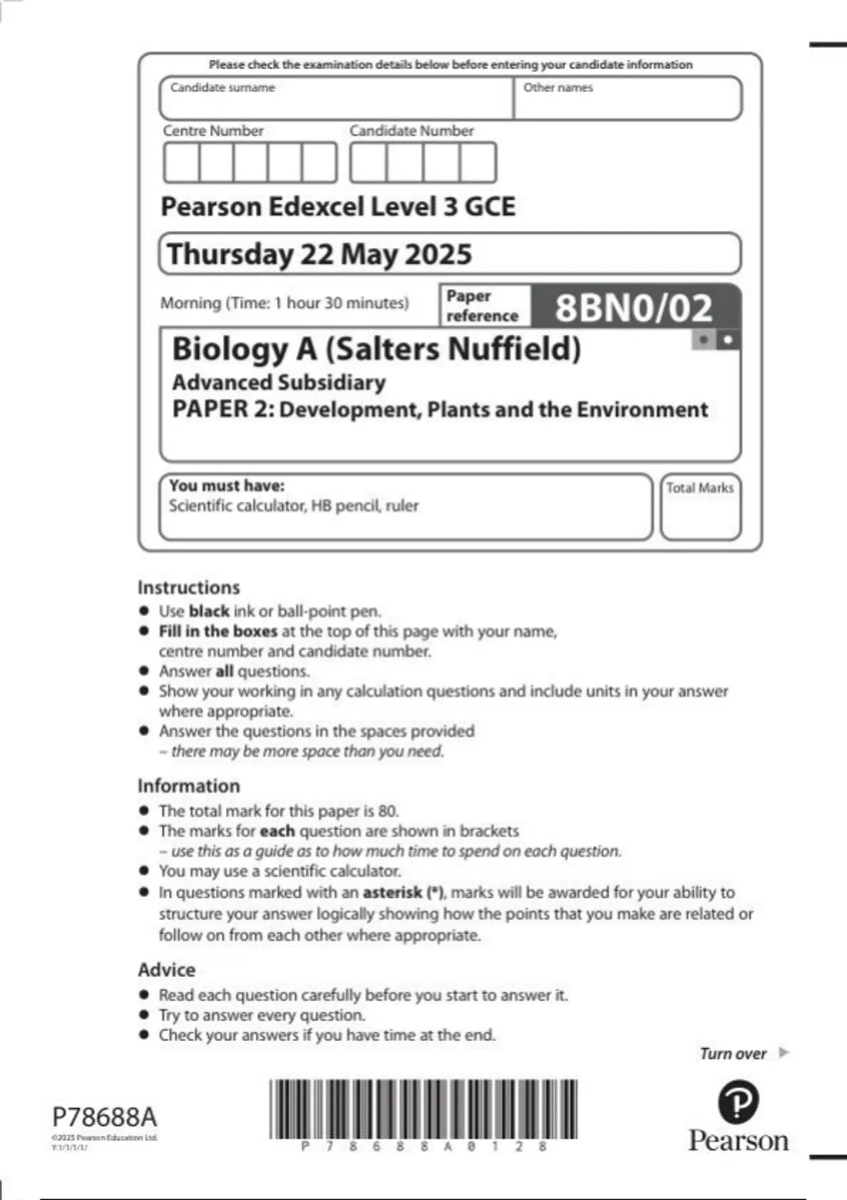 Pearson Edexcel as level Biology A |question paper | 2025|8BN0/02