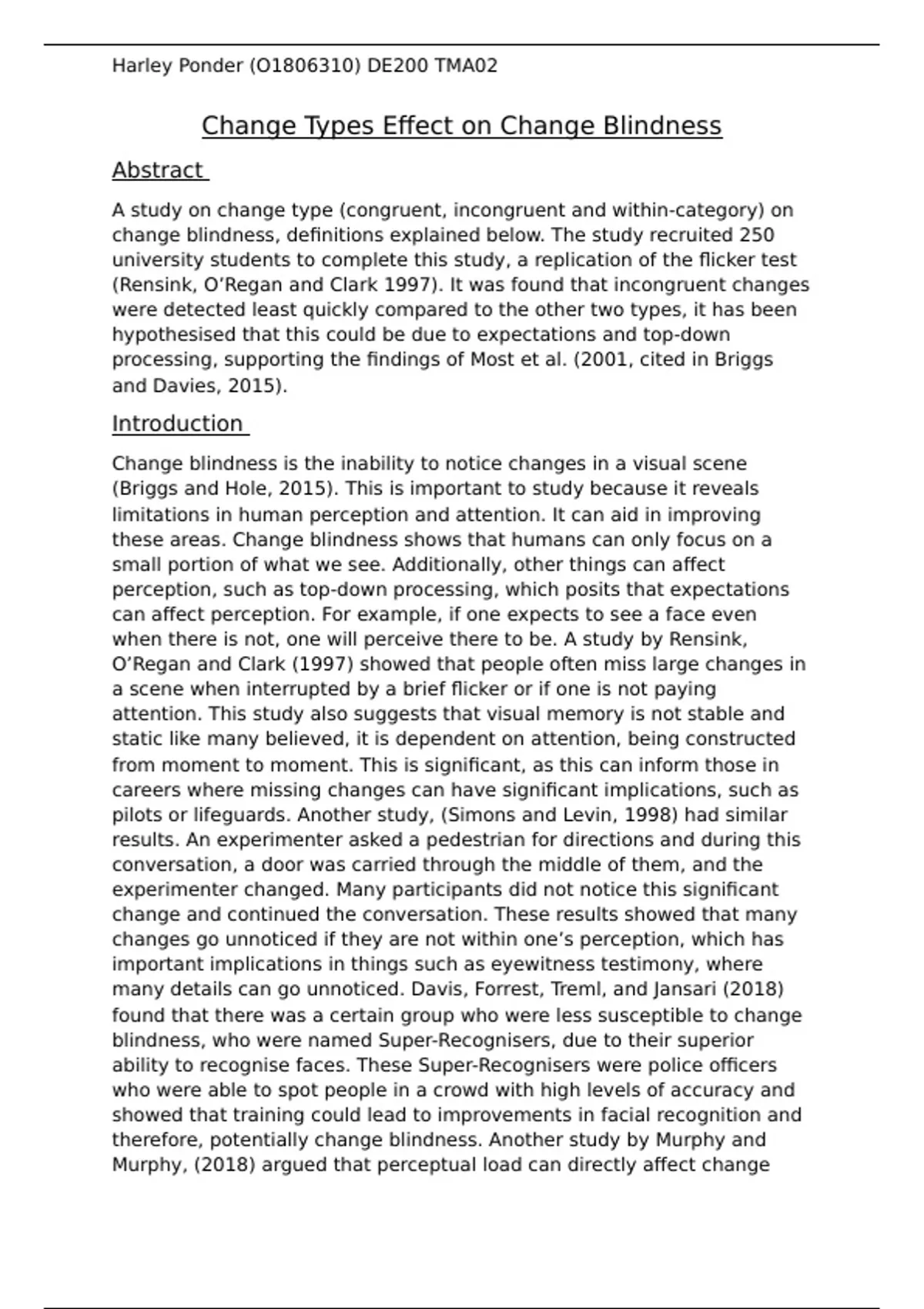 This is a mini-research project regarding a replication of the flicker test and its effect on change blindness. The student was provided with raw data of 250 participants, however they had to source one participant of their own to complete the test to source more data. This was all written up by the student. Statistical analysis/tests were also performed by the student for this research.
