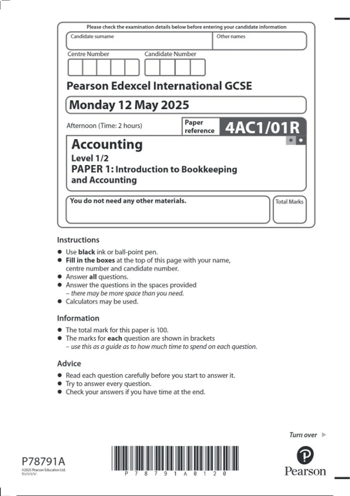 Pearson Edexcel IGCSE Accounting Level 1/2 PAPER 1R (4AC1/01R) JUNE 2025 QUESTION PAPER: Introduction to Bookkeeping and Accounting