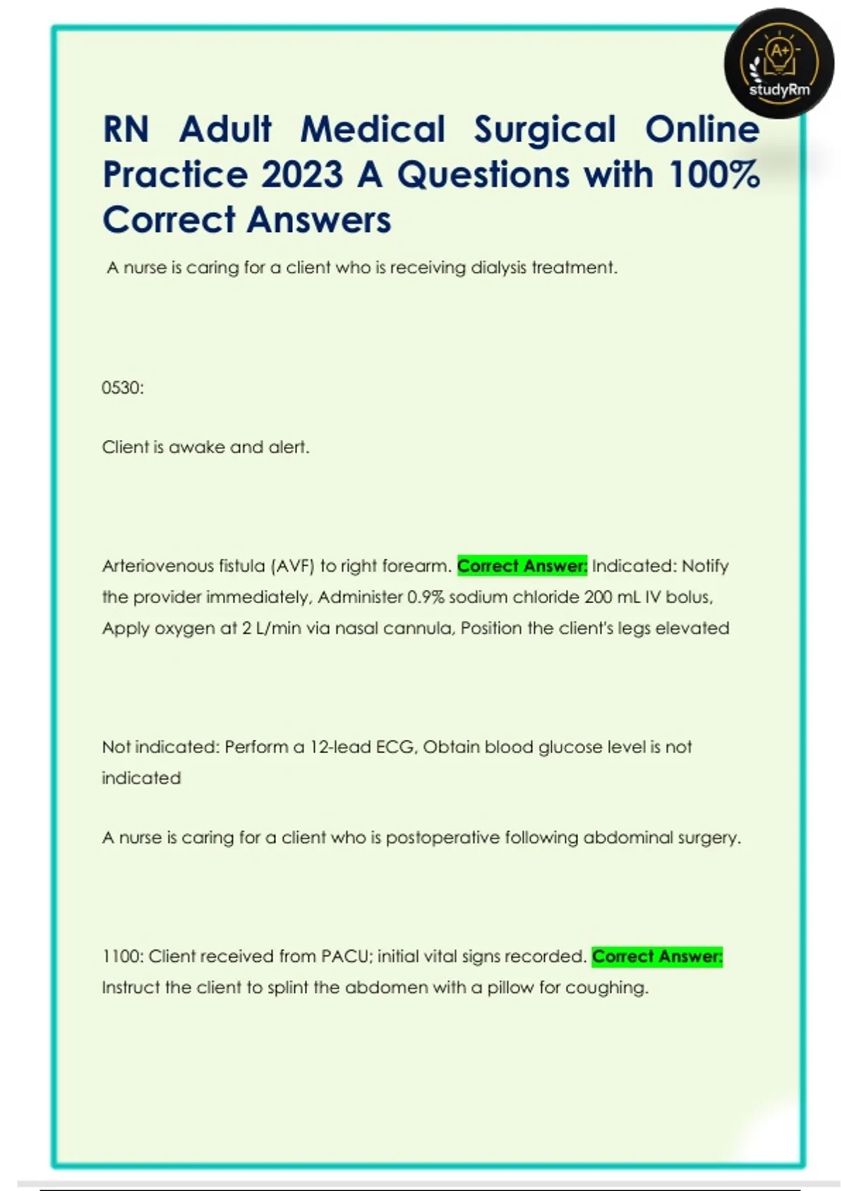 RN Adult Medical Surgical Online Practice 2023 A Questions with 100% Correct Answers