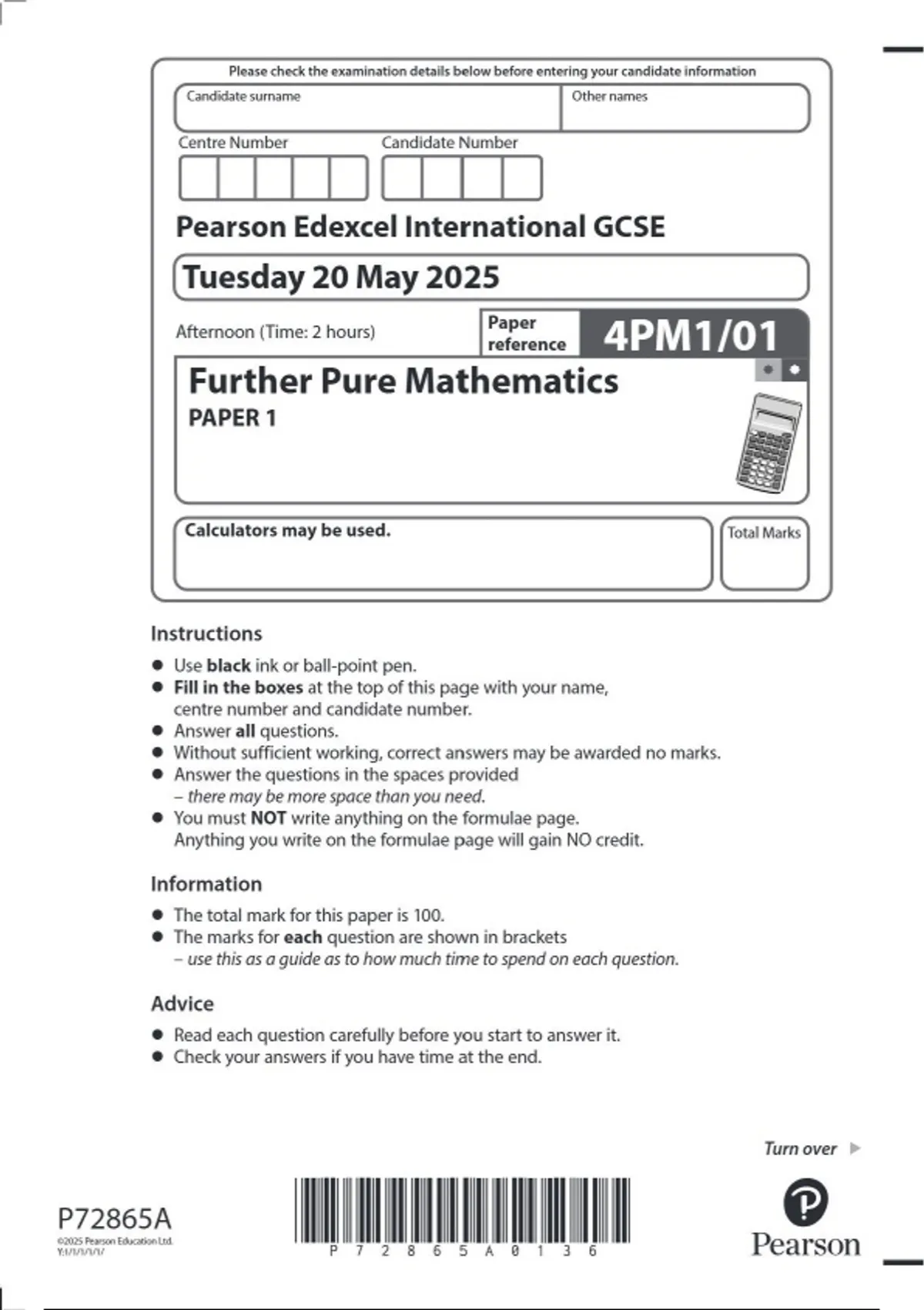 JUNE 2025 Pearson Edexcel IGCSE Further Pure Mathematics PAPER 1 (4PM1/01) QUESTION PAPER