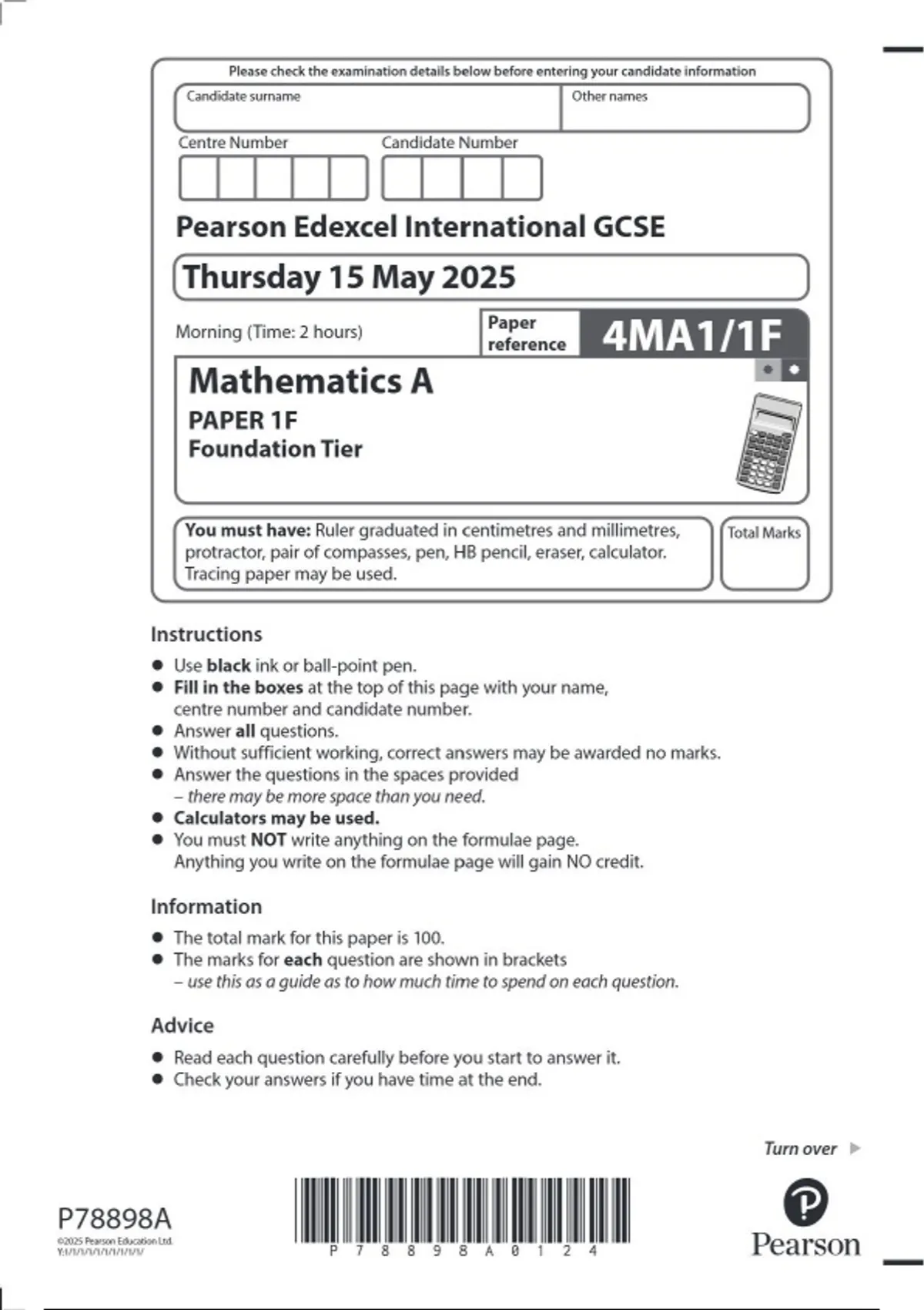 JUNE 2025 Pearson Edexcel IGCSE Mathematics A PAPER 1F (4MA1/1F) Foundation Tier QUESTION PAPER