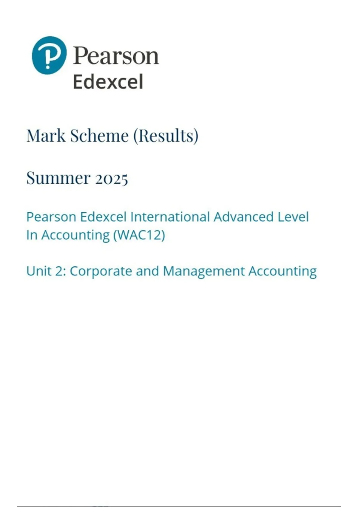 Pearson Edexcel International Advanced Level In Accounting (WAC12) Unit 2: Corporate and Management Accounting marking scheme June 2025