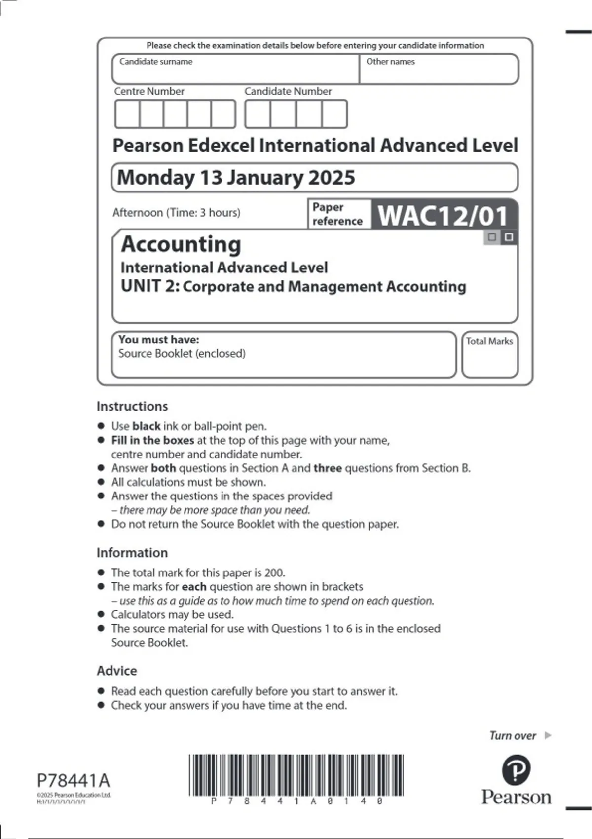Pearson Edexcel International Advanced Level Accounting WAC12/01 UNIT 2: Corporate and Management Accounting January 2025
