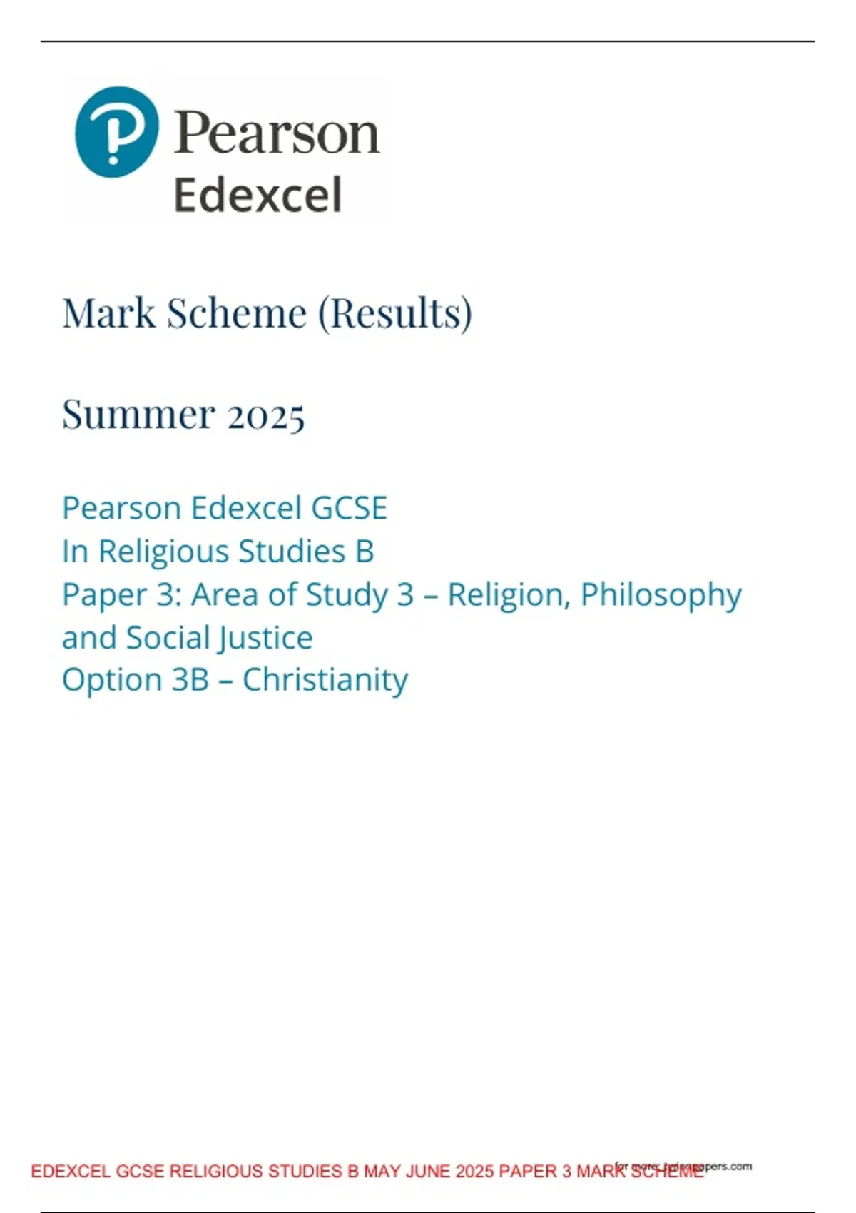 EDEXCEL GCSE RELIGIOUS STUDIES B MAY JUNE 2025 PAPER 3 MARK SCHEME