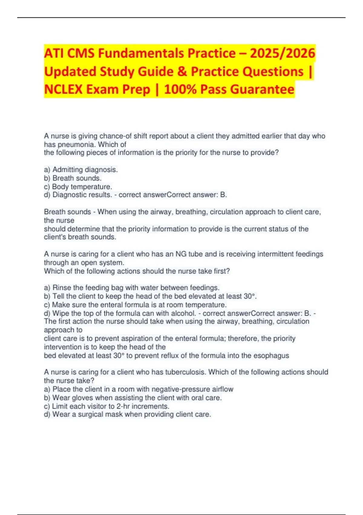Master the ATI CMS Fundamentals content with this fully updated 2025/2026 exam prep bundle, designed to help you score high and build strong confidence for both ATI exams and NCLEX success. This study pack includes: Comprehensive fundamentals review Updated ATI-style practice questions Clear, simplified explanations Nursing concepts & priority-setting guidance Critical thinking & clinical application breakdown Perfect for nursing students looking for a 100% pass-focused, organized, and exam-ready guide. Whether you’re preparing for ATI Fundamentals, CMS quizzes, or building your foundation for NCLEX, this resource gives you every tool you need.