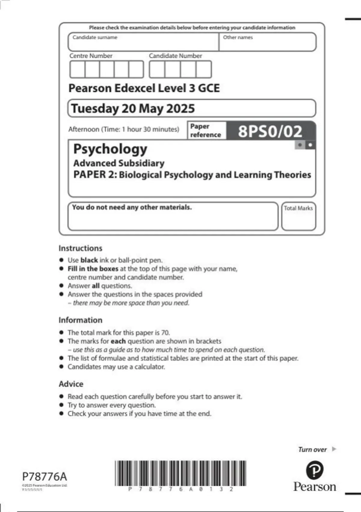 Pearson Edexcel as level Psychology|question paper |2025|8PS0/02