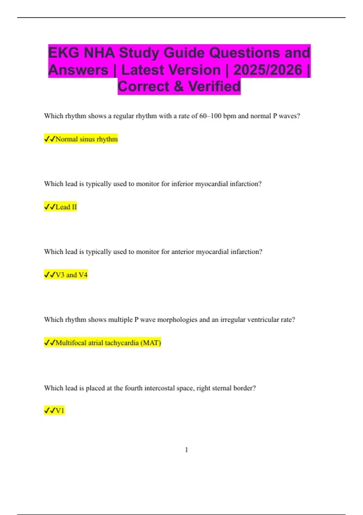 EKG NHA Study Guide Questions and Answers | Latest Version | 2025/2026 | Correct & Verified