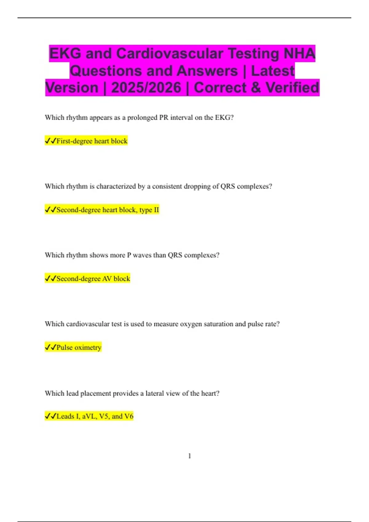 EKG and Cardiovascular Testing NHA Questions and Answers | Latest Version | 2025/2026 | Correct & Verified Which rhythm appears as a prolonged PR interval on the EKG? First-degree heart block Which rhythm is characterized by a consistent dropping of QRS complexes? Second-degree heart block, type II Which rhythm shows more P waves than QRS complexes? Second-degree AV block Which cardiovascular test is used to measure oxygen saturation and pulse rate? Pulse oximetry Which lead placement provides a lateral view of the heart? Leads I, aVL, V5, and V6 2 Which rhythm is a fast heart rate originating in the ventricles? Ventricular tachycardia Which cardiovascular test uses electrodes on the chest to evaluate heart rhythm continuously? Telemetry monitoring Which rhythm shows a regular rate with narrow QRS and no visible P waves during episodes? Supraventricular tachycardia (SVT) Which cardiovascular test measures blood pressure changes in response to posture? Tilt-table test Which rhythm is identified by inverted P waves in lead II? Junctional rhythm Which rhythm shows alternating high and low amplitude QRS complexes? Electrical alternans 3 Which rhythm shows rapid atrial activity with variable conduction to ventricles? Atrial fibrillation with rapid ventricular response What is the first step before performing any cardiovascular test on a patient? Verify patient identity and explain the procedure Which test measures the electrical activity of the heart over a 24-hour period? Holter monitor What does the QRS complex on an EKG represent? Ventricular depolarization Which lead is commonly used to monitor for arrhythmias continuously? Lead II What is the purpose of an exercise stress test? To evaluate heart function and detect ischemia during physical activity 4 Which cardiovascular test records the heart’s electrical activity from multiple angles? 12-lead EKG What is the normal duration of the PR interval? 0.12–0.20 seconds