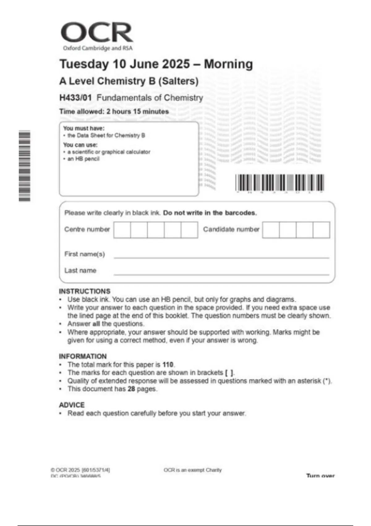 OCR 2025 A Level Chemistry B (Advancing Chemistry)Paper 1| H433-01| June 2025| Question paper and Mark scheme| MERGED