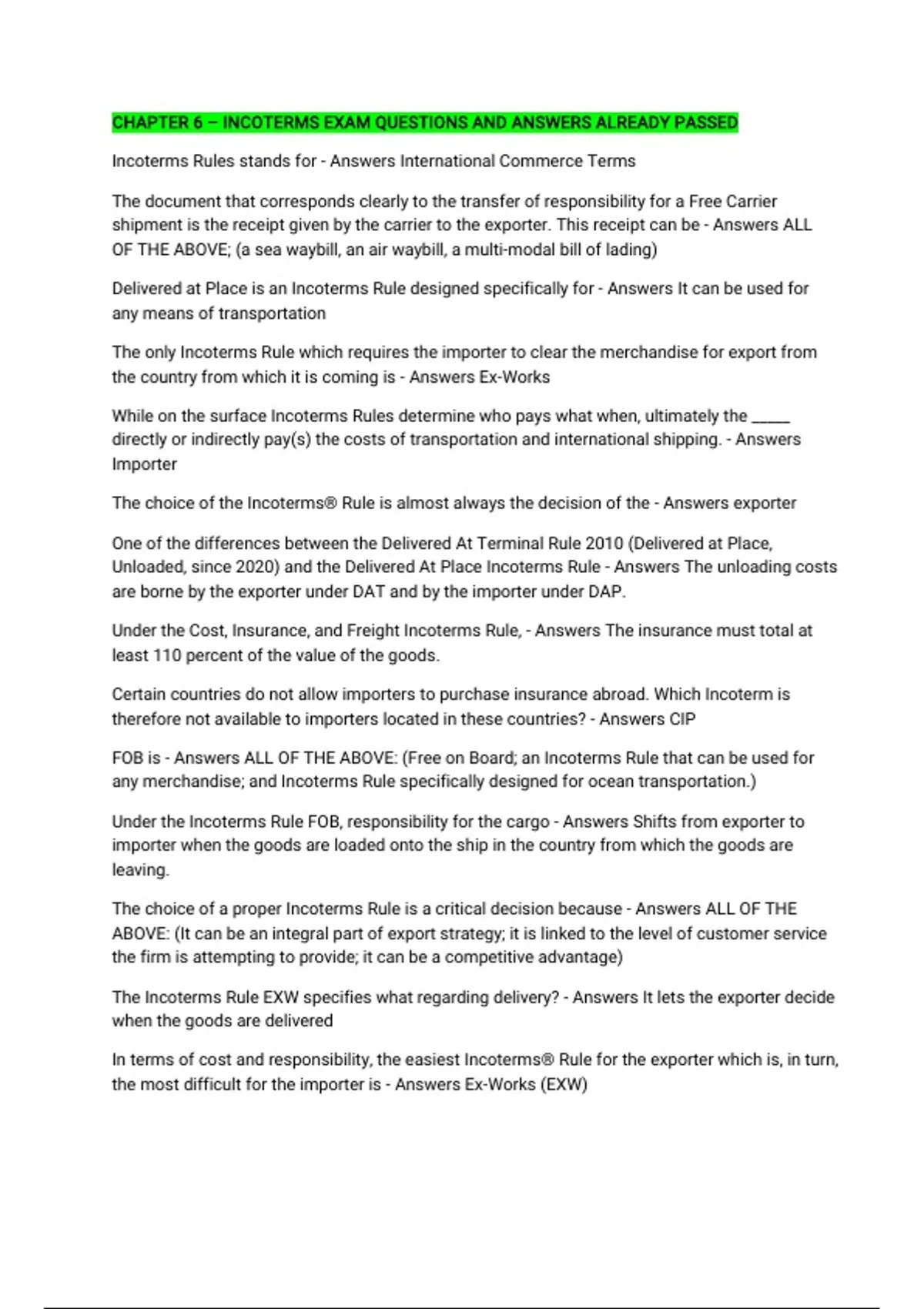CHAPTER 6 – INCOTERMS EXAM QUESTIONS AND ANSWERS ALREADY PASSED Incoterms Rules stands for - Answers International Commerce Terms The document that corresponds clearly to the transfer of responsibility for a Free Carrier shipment is the receipt given by the carrier to the exporter. This receipt can be - Answers ALL OF THE ABOVE; (a sea waybill, an air waybill, a multi-modal bill of lading) Delivered at Place is an Incoterms Rule designed specifically for - Answers It can be used for any means of transportation The only Incoterms Rule which requires the importer to clear the merchandise for export from the country from which it is coming is - Answers Ex-Works While on the surface Incoterms Rules determine who pays what when, ultimately the _____ directly or indirectly pay(s) the costs of transportation and international shipping. - Answers Importer The choice of the Incoterms® Rule is almost always the decision of the - Answers exporter One of the differences between the Delivered At Terminal Rule 2010 (Delivered at Place, Unloaded, since 2020) and the Delivered At Place Incoterms Rule - Answers The unloading costs are borne by the exporter under DAT and by the importer under DAP. Under the Cost, Insurance, and Freight Incoterms Rule, - Answers The insurance must total at least 110 percent of the value of the goods. Certain countries do not allow importers to purchase insurance abroad. Which Incoterm is therefore not available to importers located in these countries? - Answers CIP FOB is - Answers ALL OF THE ABOVE: (Free on Board; an Incoterms Rule that can be used for any merchandise; and Incoterms Rule specifically designed for ocean transportation.) Under the Incoterms Rule FOB, responsibility for the cargo - Answers Shifts from exporter to importer when the goods are loaded onto the ship in the country from which the goods are leaving. The choice of a proper Incoterms Rule is a critical decision because - Answers ALL OF THE ABOVE: (It can be an integral part of export strategy; it is linked to the level of customer service the firm is attempting to provide; it can be a competitive advantage) The Incoterms Rule EXW specifies what regarding delivery? - Answers It lets the exporter decide when the goods are delivered In terms of cost and responsibility, the easiest Incoterms® Rule for the exporter which is, in turn, the most difficult for the importer is - Answers Ex-Works (EXW)