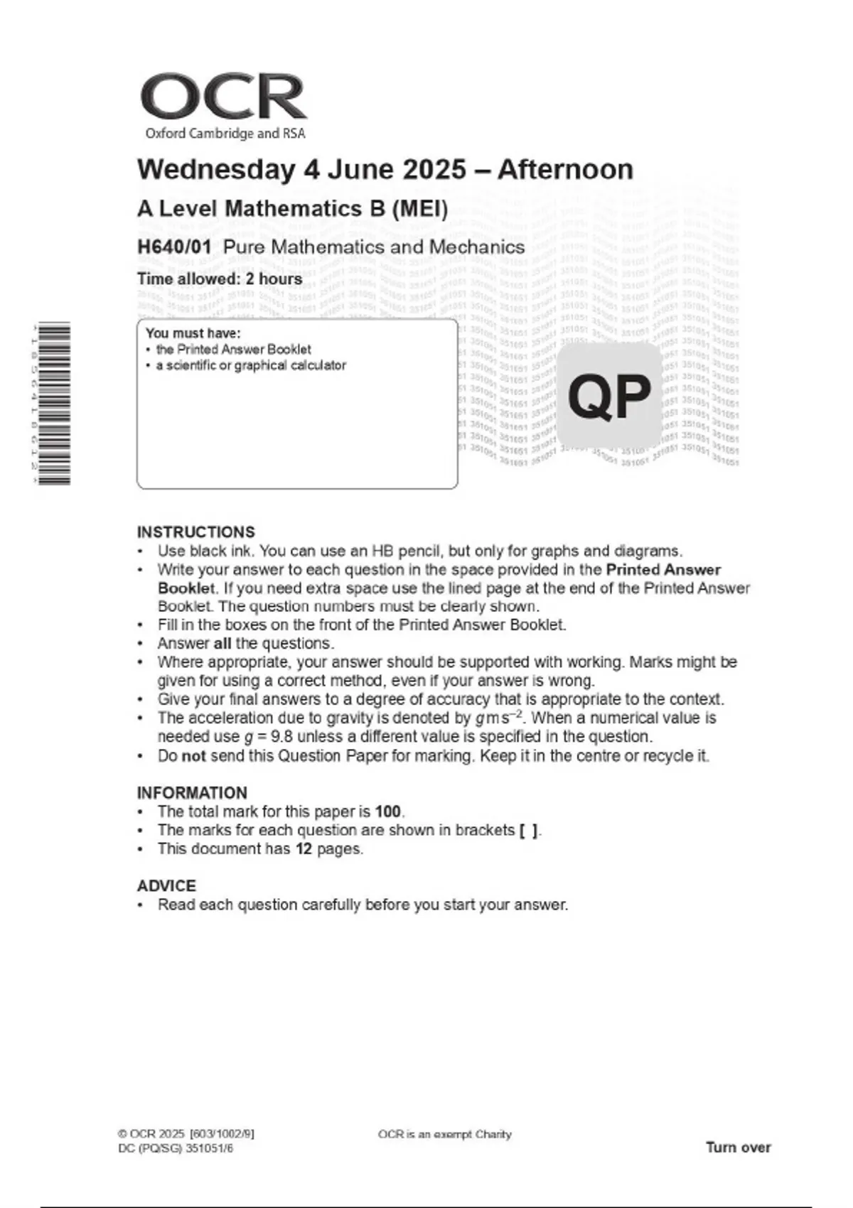 A Level Mathematics B Mei H640/01 Pure Mathematics and mechanics Question Paper June 2025