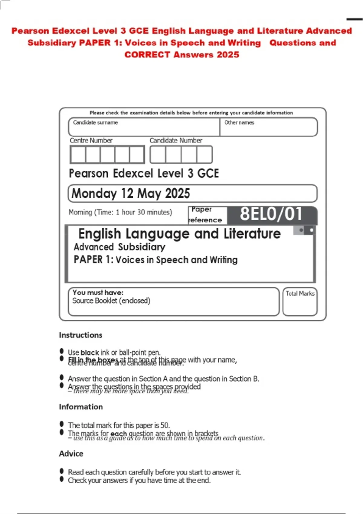 Pearson Edexcel Level 3 GCE English Language and Literature Advanced Subsidiary PAPER 1: Voices in Speech and Writing Questions and CORRECT Answers 2025