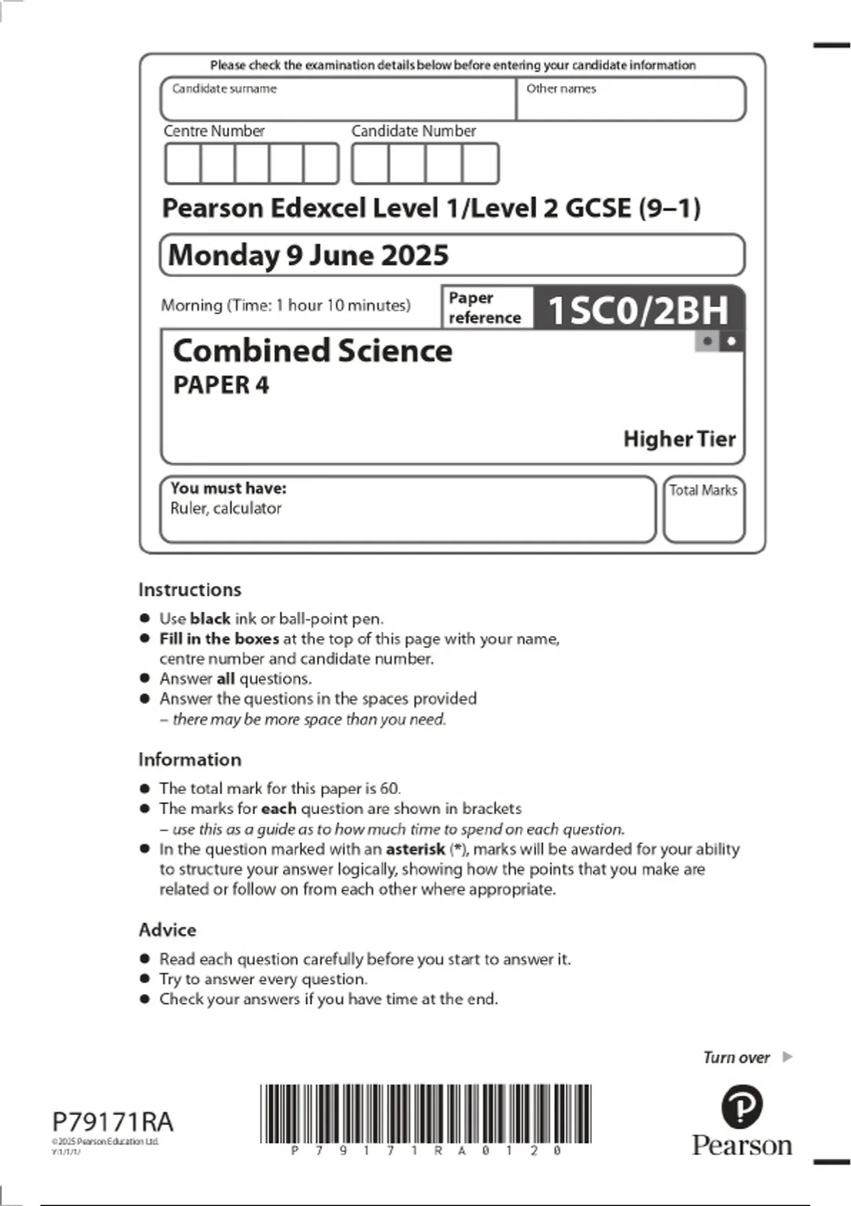2025 Pearson Edexcel Level 1/Level 2 GCSE (9–1) Combined Science PAPER 4 Higher Tier Combined Question Paper and Final Marking Scheme