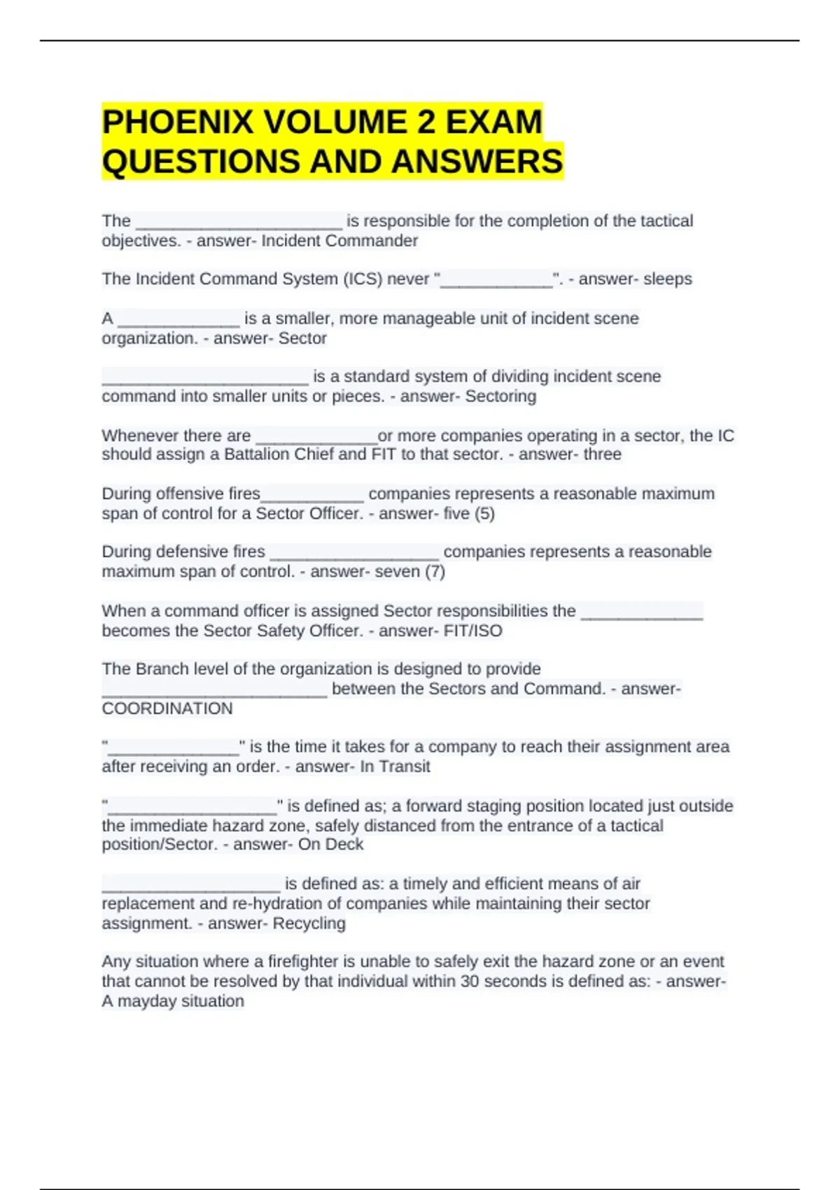 PHOENIX VOLUME 2 EXAM QUESTIONS AND ANSWERS The ______________________ is responsible for the completion of the tactical objectives. - answer- Incident Commander The Incident Command System (ICS) never "____________". - answer- sleeps A _____________ is a smaller, more manageable unit of incident scene organization. - answer- Sector ______________________ is a standard system of dividing incident scene command into smaller units or pieces. - answer- Sectoring Whenever there are _____________or more companies operating in a sector, the IC should assign a Battalion Chief and FIT to that sector. - answer- three During offensive fires___________ companies represents a reasonable maximum span of control for a Sector Officer. - answer- five (5) During defensive fires __________________ companies represents a reasonable maximum span of control. - answer- seven (7) When a command officer is assigned Sector responsibilities the _____________ becomes the Sector Safety Officer. - answer- FIT/ISO The Branch level of the organization is designed to provide ________________________ between the Sectors and Command. - answer- COORDINATION "______________" is the time it takes for a company to reach their assignment area after receiving an order. - answer- In Transit "__________________" is defined as; a forward staging position located just outside the immediate hazard zone, safely distanced from the entrance of a tactical position/Sector. - answer- On Deck ___________________ is defined as: a timely and efficient means of air replacement and re-hydration of companies while maintaining their sector assignment. - answer- Recycling Any situation where a firefighter is unable to safely exit the hazard zone or an event that cannot be resolved by that individual within 30 seconds is defined as: - answer- A mayday situation