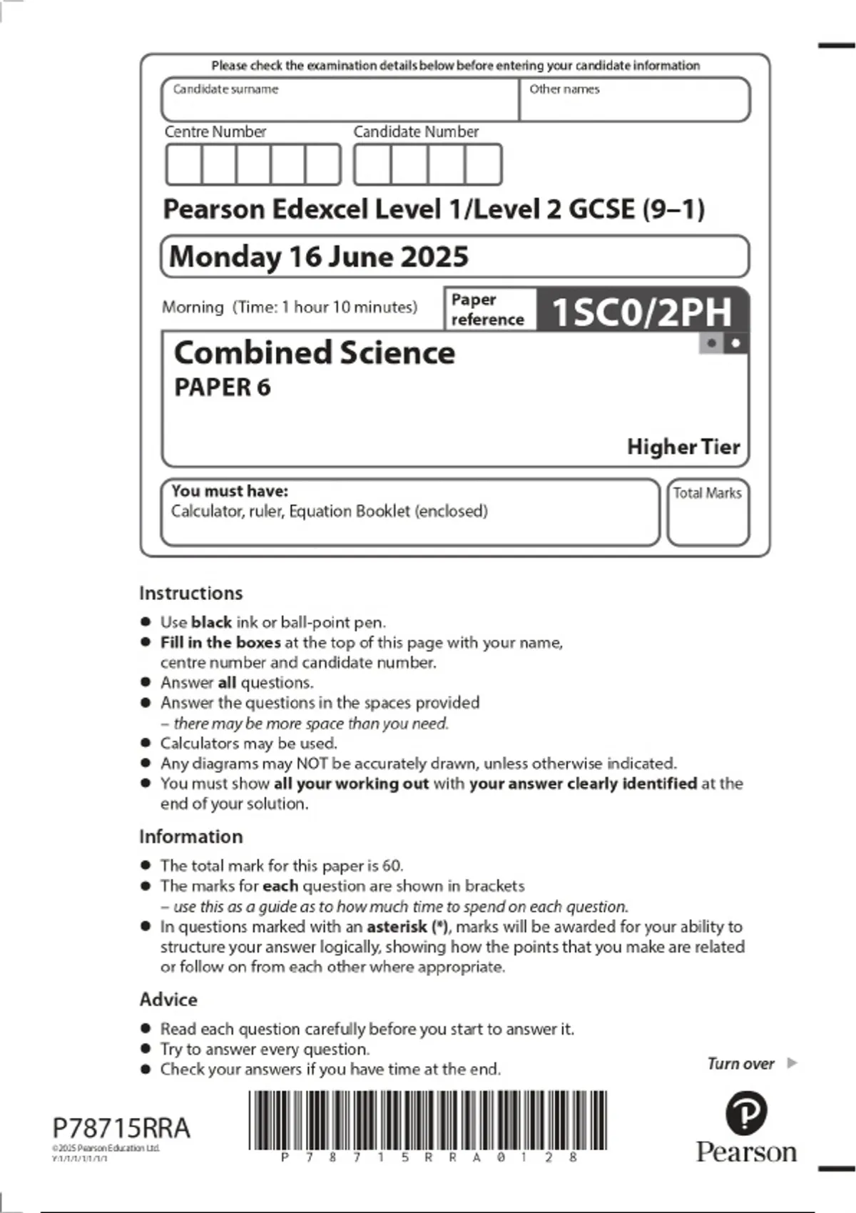 2025 Pearson Edexcel Level 1/Level 2 GCSE (9–1) Combined Science PAPER 6 Higher Tier Combined Question Paper and Final Marking Scheme
