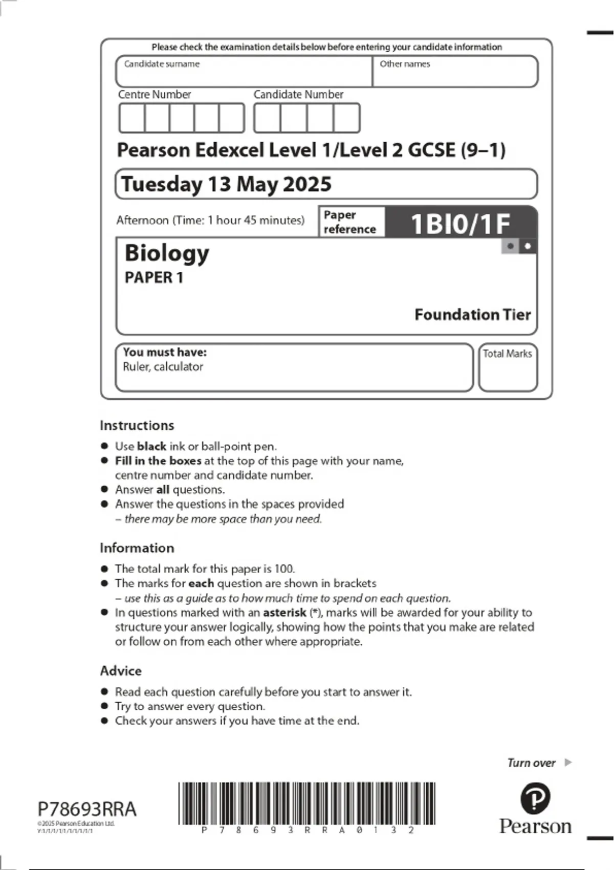 2025 Pearson Edexcel Level 1/Level 2 GCSE (9–1) Biology PAPER 1 Foundation Tier Combined Question Paper and Final Marking Scheme