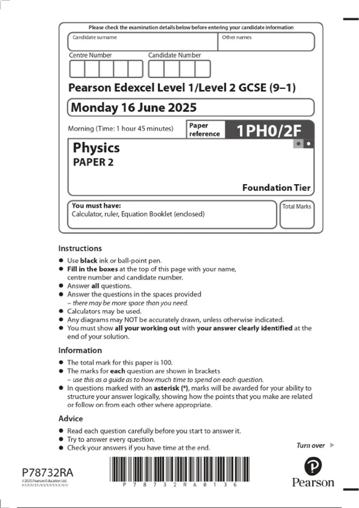 2025 Pearson Edexcel Level 1/Level 2 GCSE (9–1) Physics PAPER 2 Foundation Tier Combined Question Paper and Final Marking Scheme