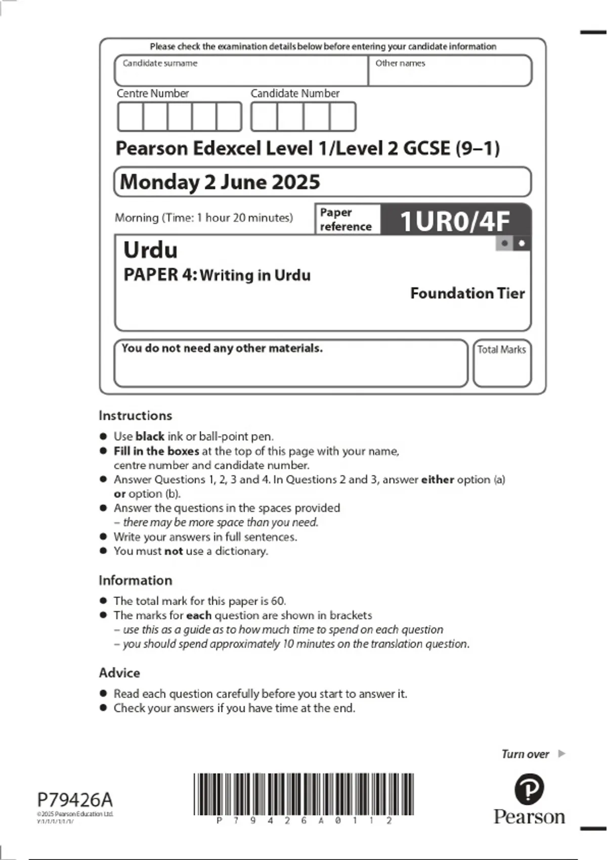 2025 Pearson Edexcel Level 1/level 2 GCSE (9-1) Urdu PAPER 4: Writing in Urdu Foundation Tier Combined Question Paper and Final Marking Scheme