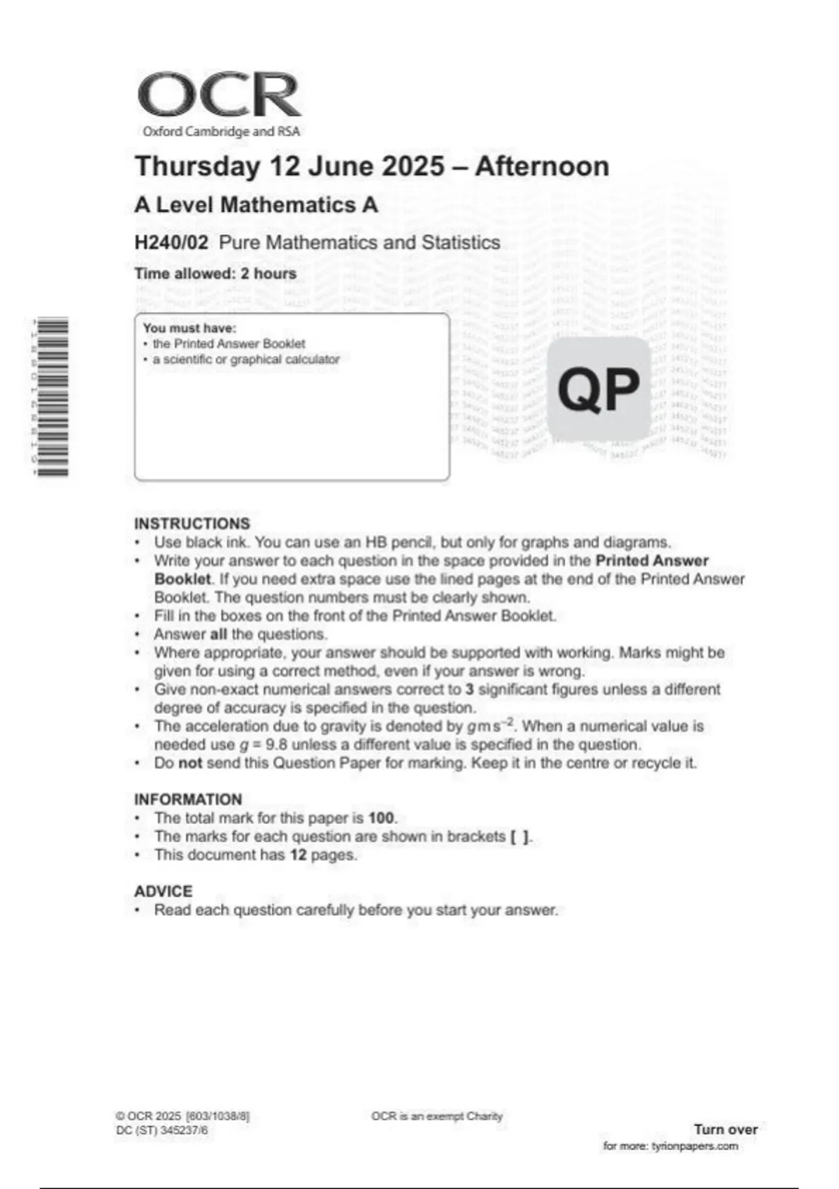 OCR 2025 A Level MATHEMATICS A Paper 2| H430-02|June 2025|Question paper and Mark scheme|MERGED