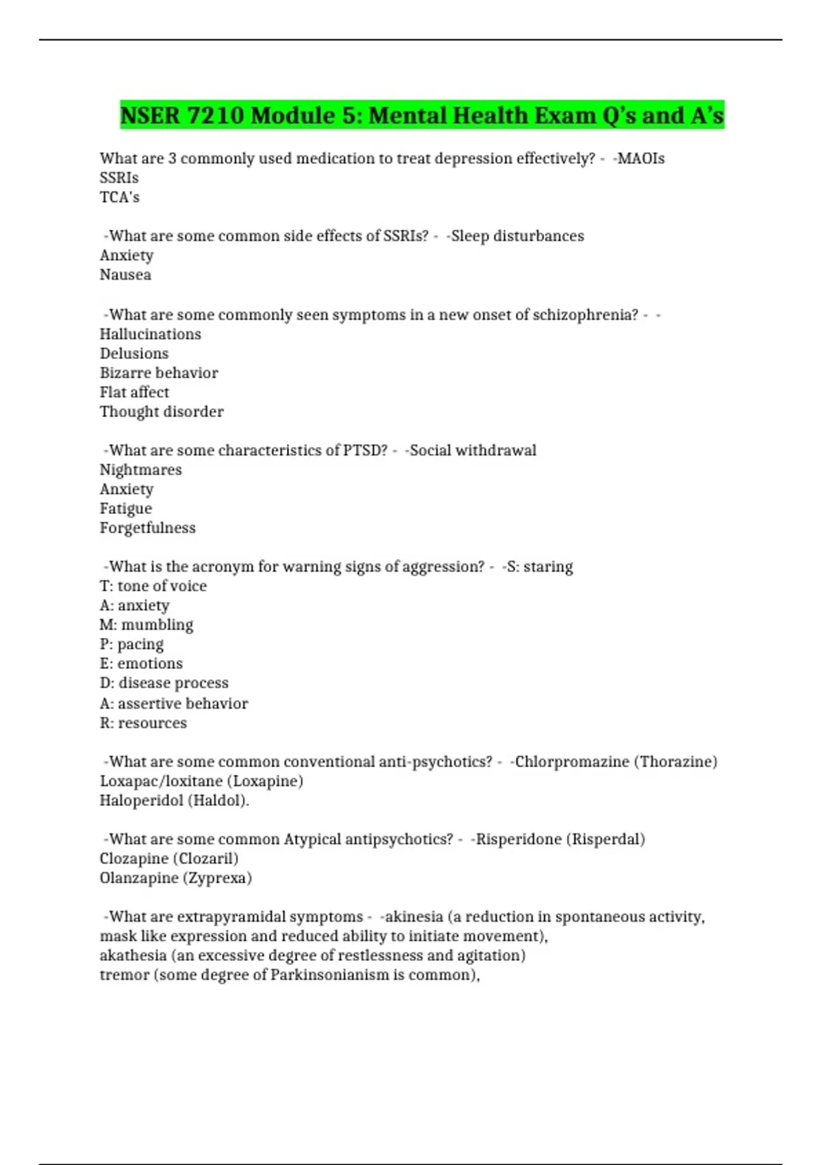 NSER 7210 Module 5: Mental Health Exam Q’s and A’s