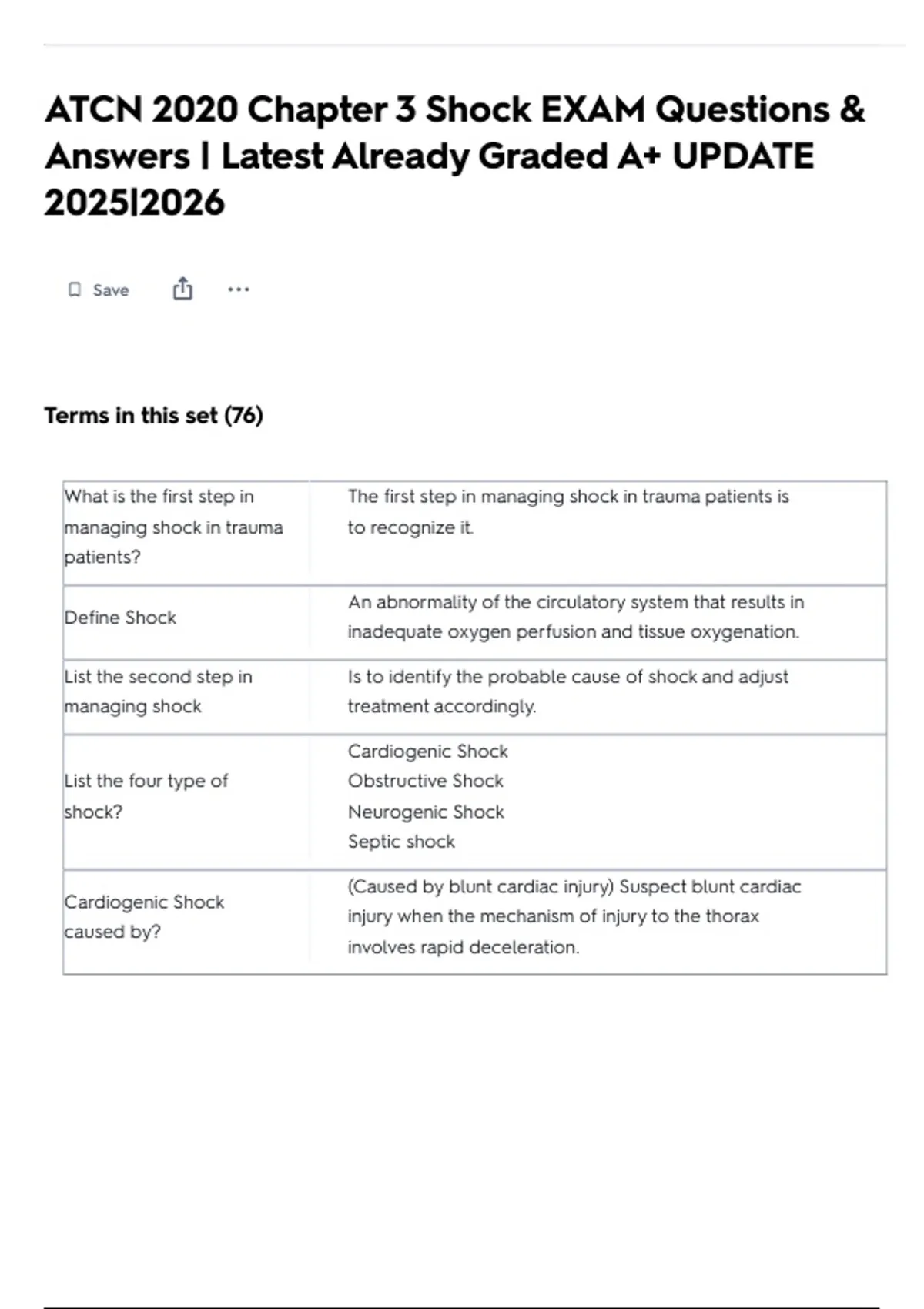 ATCN 2020 Chapter 3 Shock EXAM Questions & Answers | Latest Already Graded A+ UPDATE 2025|2026