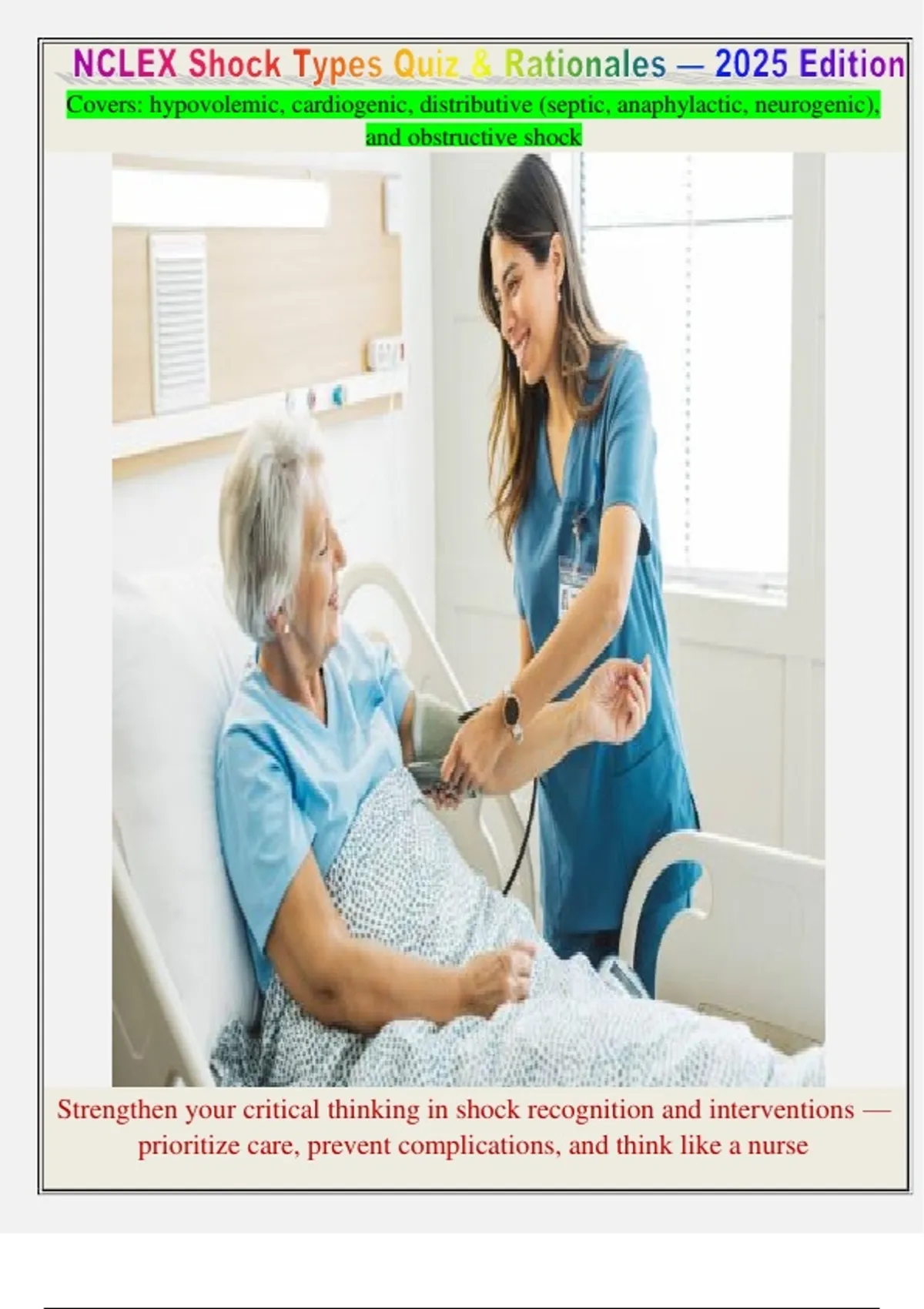 This NCLEX Shock Types Quiz (2025 Edition) gives you a clear, focused, high-yield review of all major shock classifications—Hypovolemic, Cardiogenic, Septic, Anaphylactic, Neurogenic, and Obstructive. Designed for fast learning and deep understanding, this guide includes NCLEX-style questions with detailed rationales to help you master clinical judgment and improve exam performance. Inside this document, you’ll find: • Shock questions modeled after NCLEX 2025 updates • Clear, simple, exam-ready rationales • Quick comparison charts for all shock types • High-yield clinical signs, interventions, labs, and priorities • Practice that strengthens critical thinking and Med-Surg readiness Perfect for: • NCLEX 2025 prep • Med-Surg Nursing exams • HESI practice • Emergency/critical care review • Fast study sessions before exams Easy to navigate, exam-focused, and designed to help you understand WHY each answer is correct. A must-have for any nursing student preparing for NCLEX or Med-Surg assessments.
