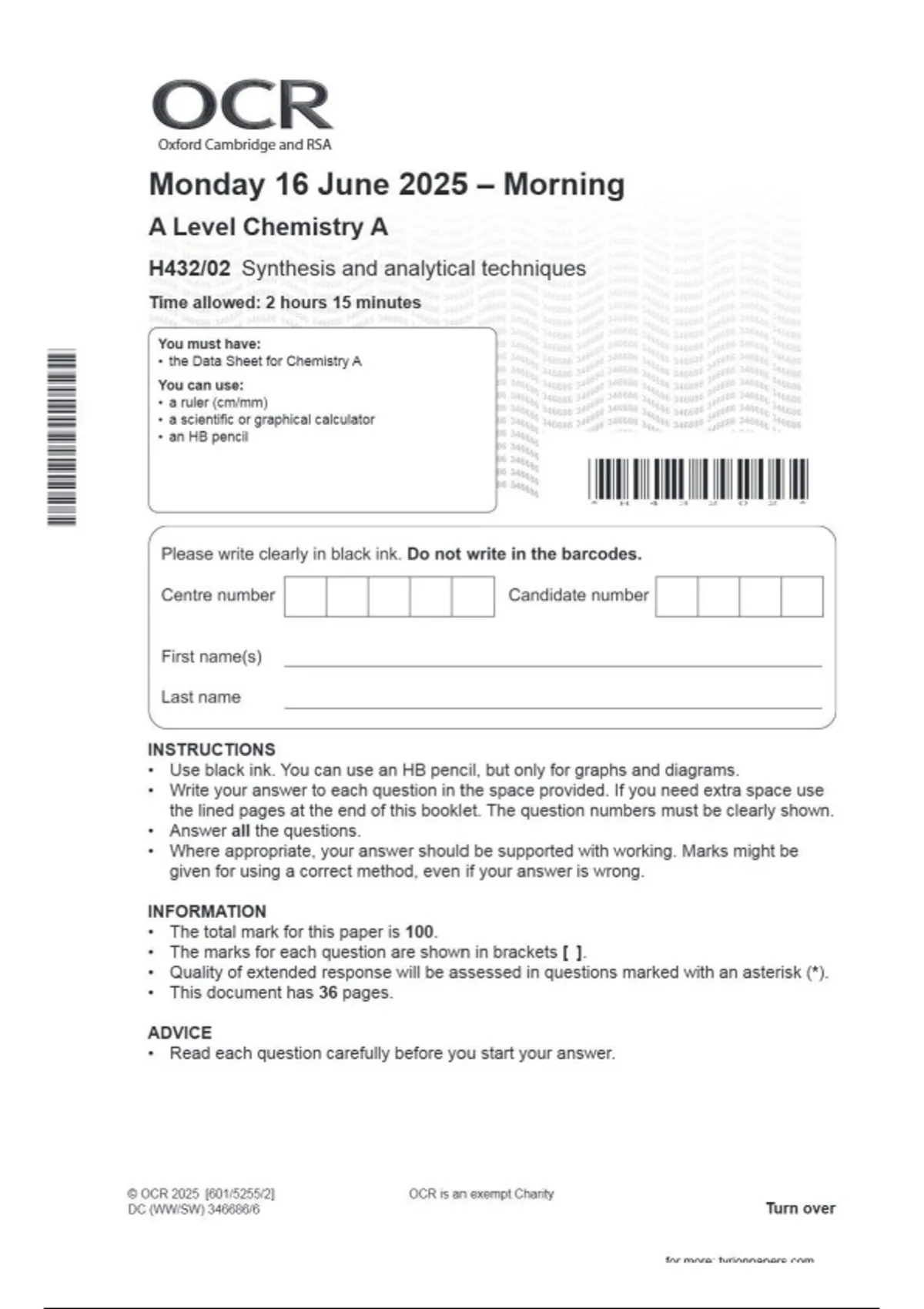 OCR A Level Chemistry A H432/02 Synthesis and analytical techniques June 2025