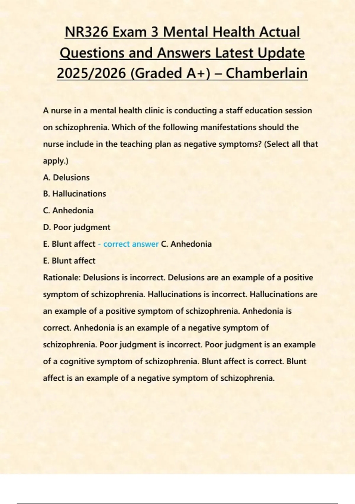 NR326 Exam 3 Mental Health Actual Questions and Answers Latest Update 2025/2026 (Graded A+) – Chamberlain