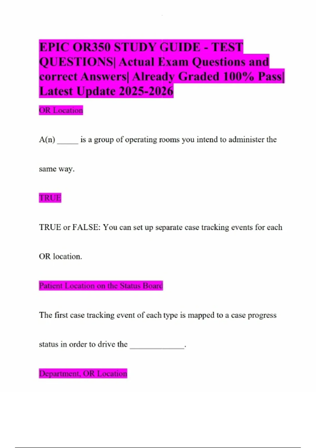 EPIC OR350 STUDY GUIDE - TEST QUESTIONS| Actual Exam Questions and correct Answers| Already Graded 100% Pass| Latest Update OR Location A(n) _____ is a group of operating rooms you intend to administer the same way. TRUE TRUE or FALSE: You can set up separate case tracking events for each OR location. Patient Location on the Status Board The first case tracking event of each type is mapped to a case progress status in order to drive the _____________. Department, OR Location When logging in to Hyperspace, a user first enters his ID and password, and then logs in to a __________________. When creating a case, a scheduler chooses a(n) ________________ that contains rooms where it can be scheduled. Choose the best answer from the list below: 1 Dr. Abraham and Dr. Smith are performing "Coronary Artery Bypass." The case request for this surgery shows that they will use 2 3-0 silk sutures. Dr. Bentley is also performing "Coronary Artery Bypass." Her case request shows 4 3-0 silk sutures. How many base procedures are involved in this scenario? ALIAS Which of the field must be edited to allow schedulers to look up this procedure by typing "SPLRE" in the Procedure field on the Case Entry Form? TRUE True or False: Schedulers can look up this procedure by typing "SPLEEN" in the Procedure field without any changes to this screen. Room (SER) An operating room is a record in the ___________________ master file. (Circle one.) FALSE True or False: The four different types of blocks are Service, Surgeon, Team, and Unblocked.