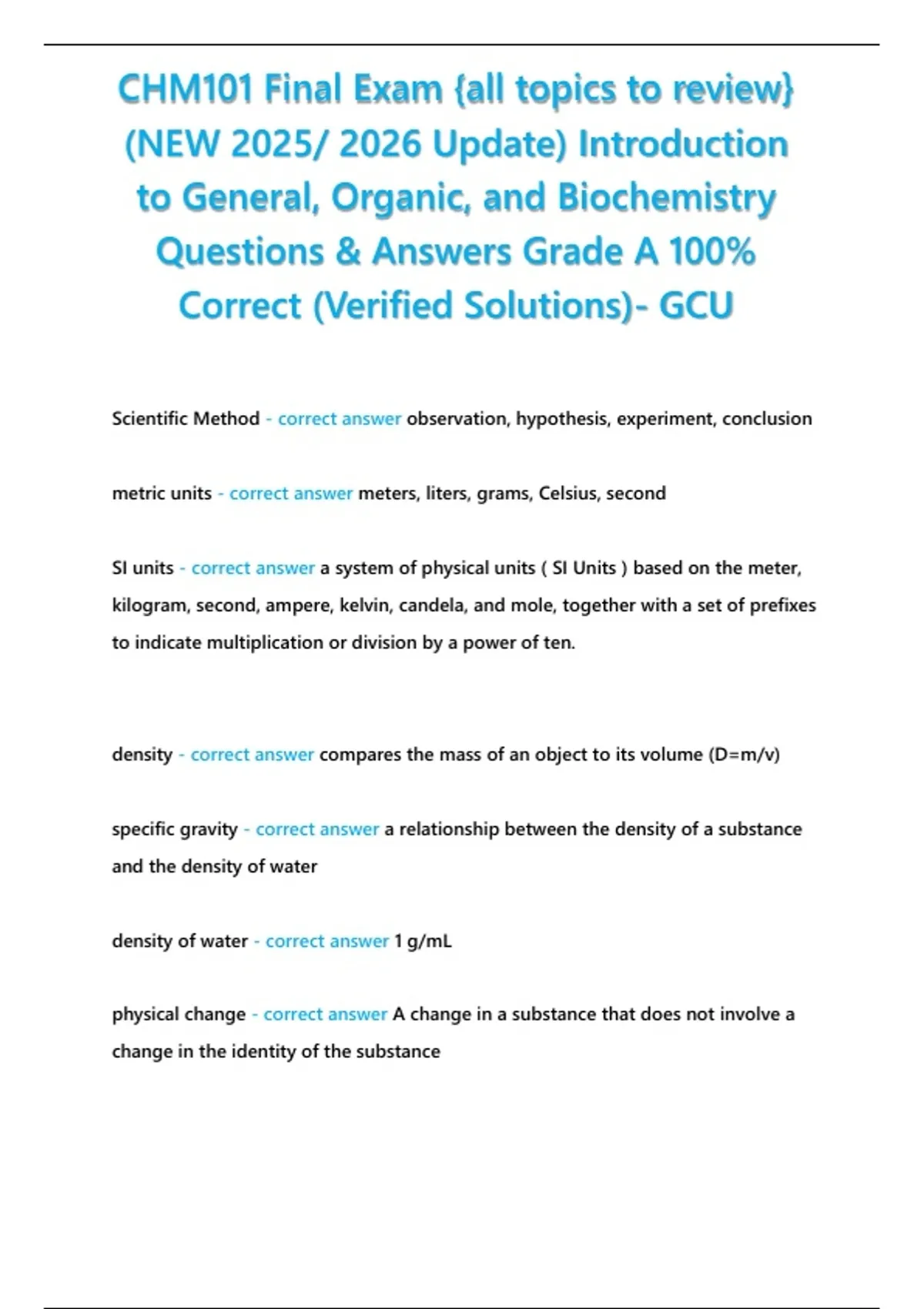 CHM101 Final Exam (NEW 2025/ 2026 Update) Introduction to General, Organic, and Biochemistry Questions & Answers Grade A 100% Correct (Verified Solutions)- GCU