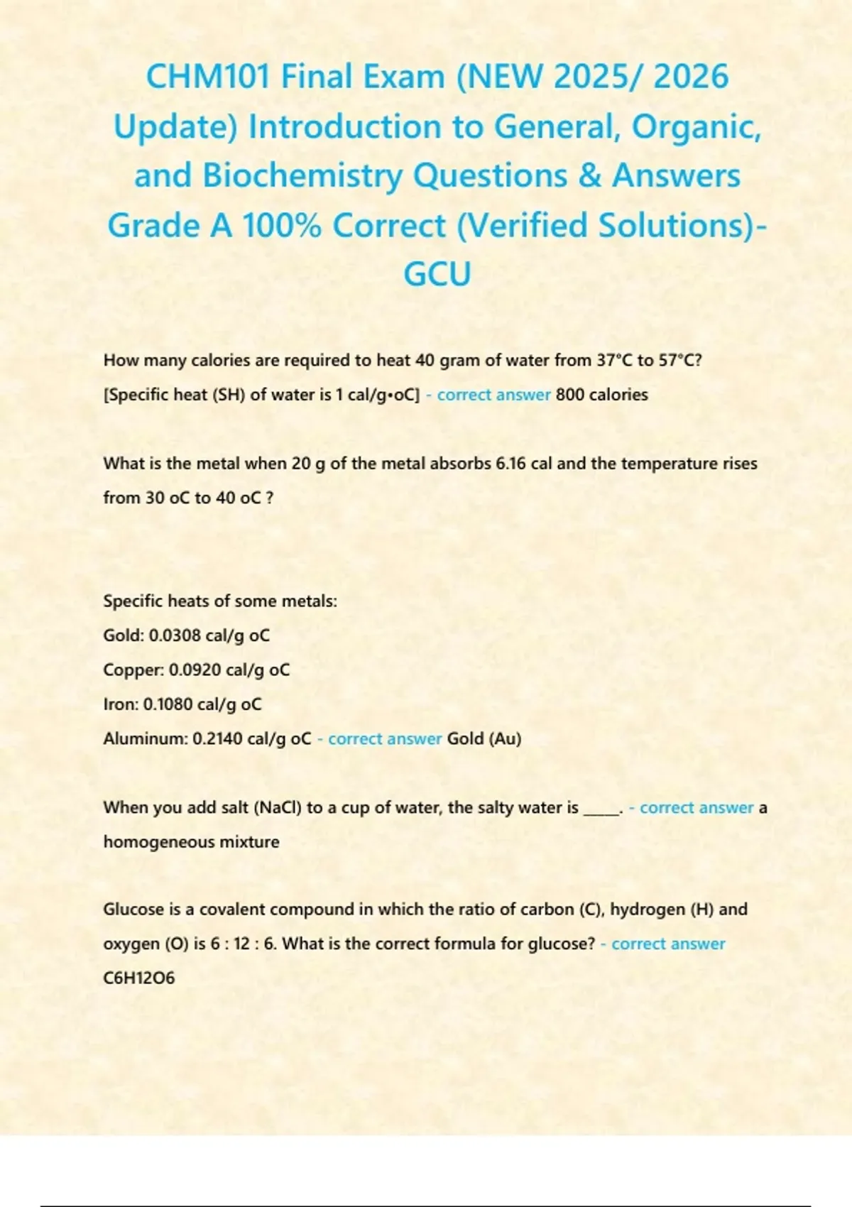 CHM101 Final Exam (NEW 2025/ 2026 Update) Introduction to General, Organic, and Biochemistry Questions & Answers Grade A 100% Correct (Verified Solutions)- GCU
