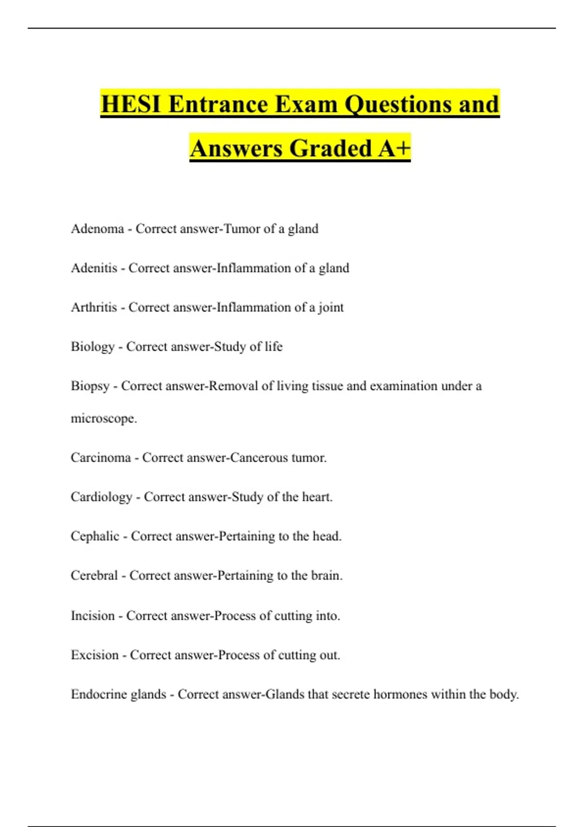 HESI Entrance Exam Questions and Answers Graded A+