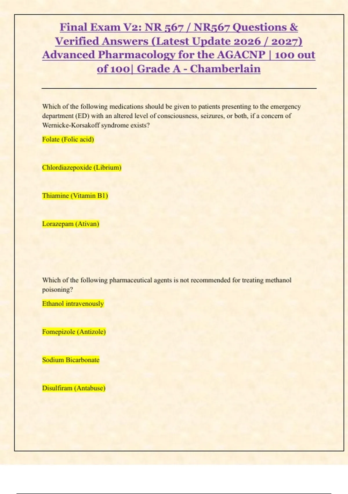 Final Exam V2: NR 567 / NR567 Questions & Verified Answers (Latest Update 2026 / 2027) Advanced Pharmacology for the AGACNP| Solved