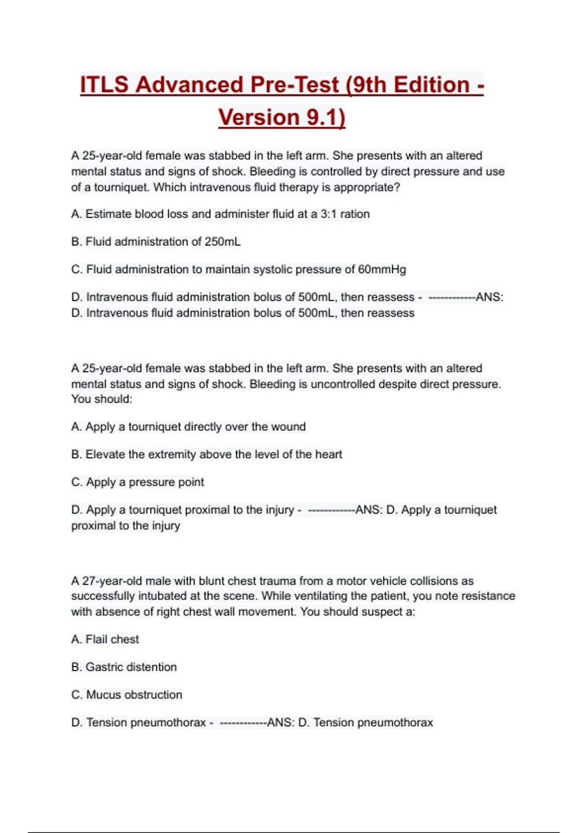 ITLS Advanced Pre-Test (9th Edition - Version 9.1) Questions with correct Answers (A+ GRADED 100% VERIFIED)| 2025/2026