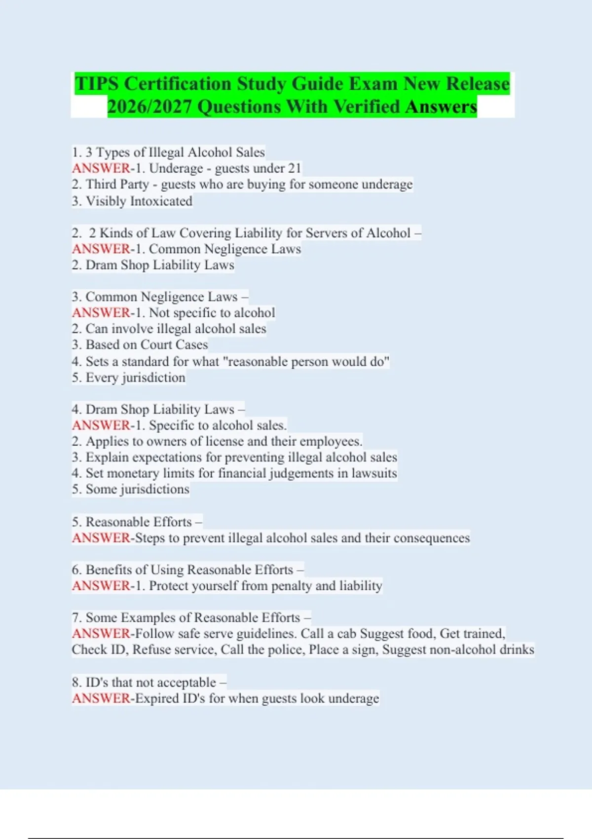 Official TIPS Certification Study Guide for 2026/2027 with verified exam questions and answers. Covers alcohol sales laws, liability prevention, checking IDs, recognizing intoxication, behavioral cues, BAC levels, and responsible serving techniques. Essential for servers, bartenders, and hospitality professionals preparing for TIPS certification. 1. 3 Types of Illegal Alcohol Sales ANSWER-1. Underage - guests under 21 2. Third Party - guests who are buying for someone underage 3. Visibly Intoxicated 2. 2 Kinds of Law Covering Liability for Servers of Alcohol – ANSWER-1. Common Negligence Laws 2. Dram Shop Liability Laws 3. Common Negligence Laws – ANSWER-1. Not specific to alcohol 2. Can involve illegal alcohol sales 3. Based on Court Cases 4. Sets a standard for what "reasonable person would do" 5. Every jurisdiction 4. Dram Shop Liability Laws – ANSWER-1. Specific to alcohol sales. 2. Applies to owners of license and their employees. 3. Explain expectations for preventing illegal alcohol sales 4. Set monetary limits for financial judgements in lawsuits 5. Some jurisdictions 5. Reasonable Efforts – ANSWER-Steps to prevent illegal alcohol sales and their consequences 6. Benefits of Using Reasonable Efforts – ANSWER-1. Protect yourself from penalty and liability 7. Some Examples of Reasonable Efforts – ANSWER-Follow safe serve guidelines. Call a cab Suggest food, Get trained, Check ID, Refuse service, Call the police, Place a sign, Suggest non-alcohol drinks 8. ID's that not acceptable – ANSWER-Expired ID's for when guests look underage Any sign that the ID has been altered