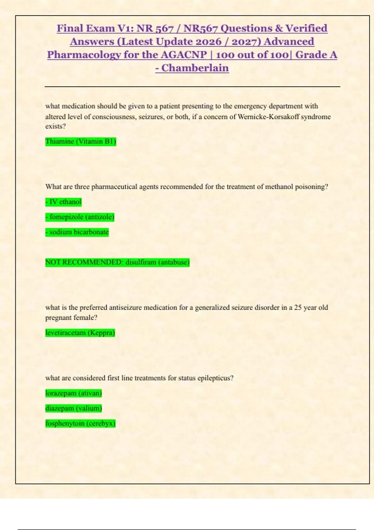 Final Exam V1: NR 567 / NR567 Questions & Verified Answers (Latest Update 2026 / 2027) Advanced Pharmacology for the AGACNP | Solved